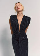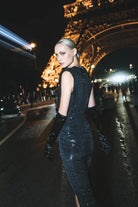 El Vestido Gala, es un vestido largo de lentejuelas negras. La parte delantera presenta un escote en 'V'. El tejido está drapeado desde el busto hasta la cintura con pliegues. Todo el vestido lleva un forro de tul elástico. Las lentejuelas están distribuidas en todo el vestido. El corte es sin mangas, con hombros estructurados. Incluye un nudo central en la parte delantera.