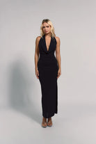 El Vestido Glam, es un vestido largo con cuello drapeado y tirantes halter. Es ajustado al cuerpo. La parte trasera del vestido es descubierta, sujeta por un tirante. Cuenta con abertura lateral en la falda.