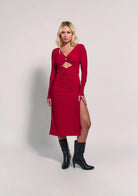 Vestido Isadora, es un vestido midi ajustado. Presenta un corte frontal en el pecho con una argolla de metal dorado rodeada de fruncido. Tiene fruncido en la parte delantera de la cintura. Lleva mangas largas y abertura lateral en la falda.