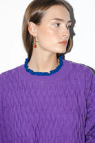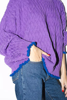 Este sweater tejido se destaca por su diseño relajado y su vibrante combinación de colores. Presenta una base en tono púrpura con detalles en azul en los bordes de las mangas y el dobladillo, agregando un toque distintivo. Su textura de punto aporta calidez y comodidad, siendo ideal para cualquier ocasión.