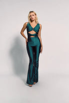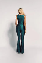 Las piernas son de corte recto y largo, ajustadas en las caderas y más sueltas hacia los tobillos, lo que da una silueta estilizada y alargada. Este mono resalta la silueta de manera moderna y atrevida.