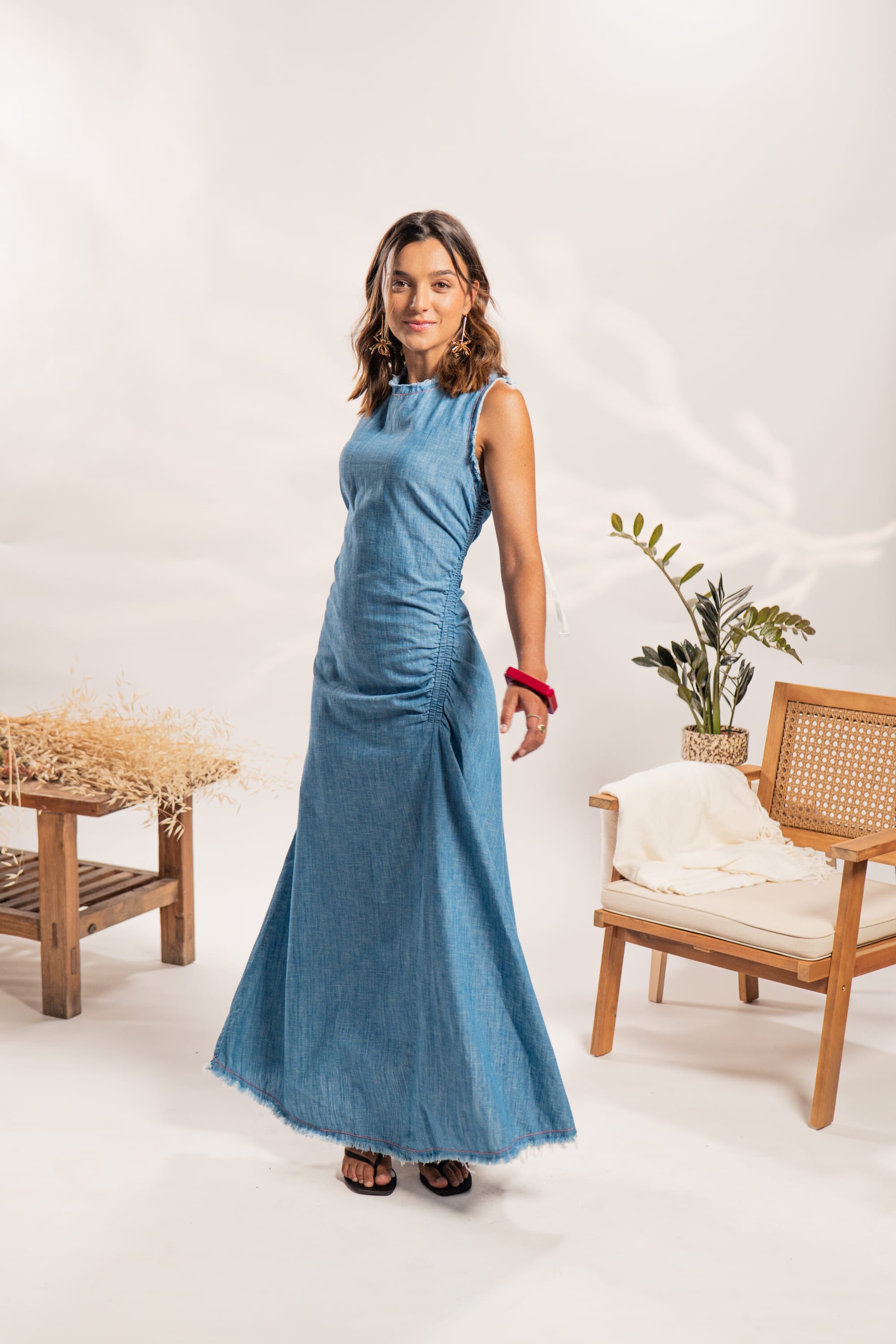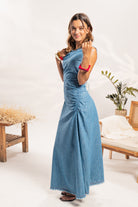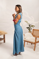 Vestido largo confeccionado en 100%algodón eco-denim liviano, ideal para un look fresco y natural. Su diseño sin mangas presenta terminaciones deshilachadas, un delicado lazo ajustable en la espalda y un fruncido lateral que estiliza la figura con sutileza. La falda cae de forma amplia hasta los tobillos, combinando comodidad con un toque boho chic perfecto para el día a día.