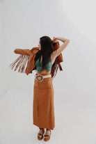 La Falda Larga de Cuero con Tajo en el Medio es una prenda sofisticada y única que combina el lujo del cuero con un diseño elegante. Su corte largo y el tajo central le aportan un toque de sensualidad y movimiento, mientras mantiene un estilo refinado. Ideal para ocasiones especiales o para darle un giro atrevido a tus looks diarios.