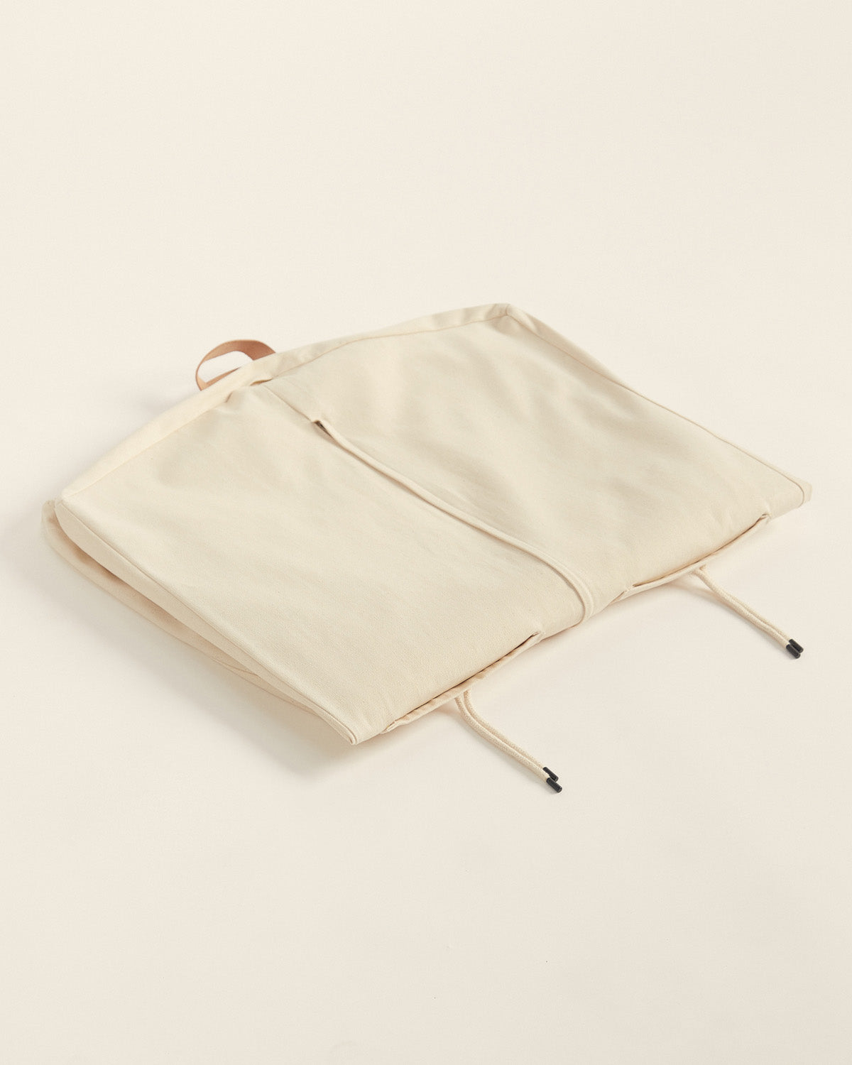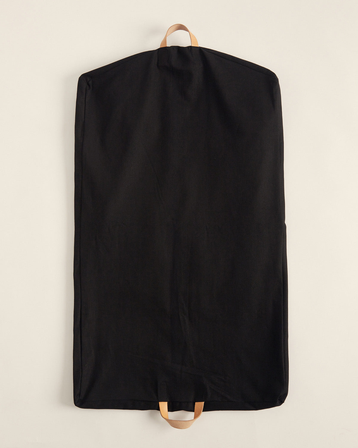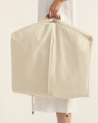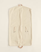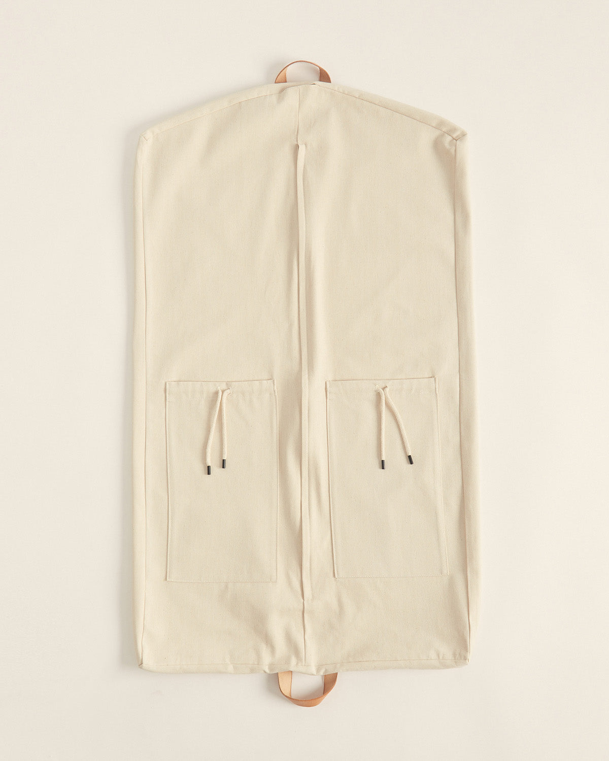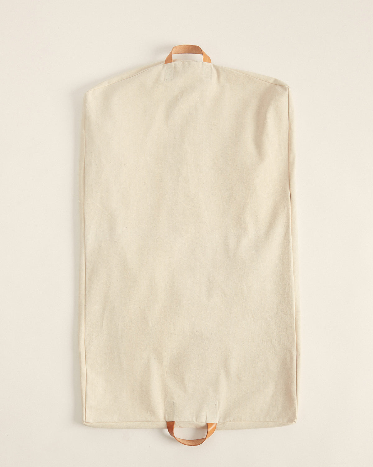 Funda protectora para ropa confeccionada con fibras naturales y manijas de cuero. Ideal para trasladar tus vestidos/trajes favoritos.