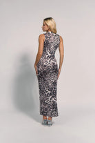 El Vestido Seductora, es un vestido ajustado, largo hasta los tobillos, con estampado de leopardo en tonos gris y negro, de tela elástica. Tiene cuello alto, sin mangas, y abertura lateral alta.