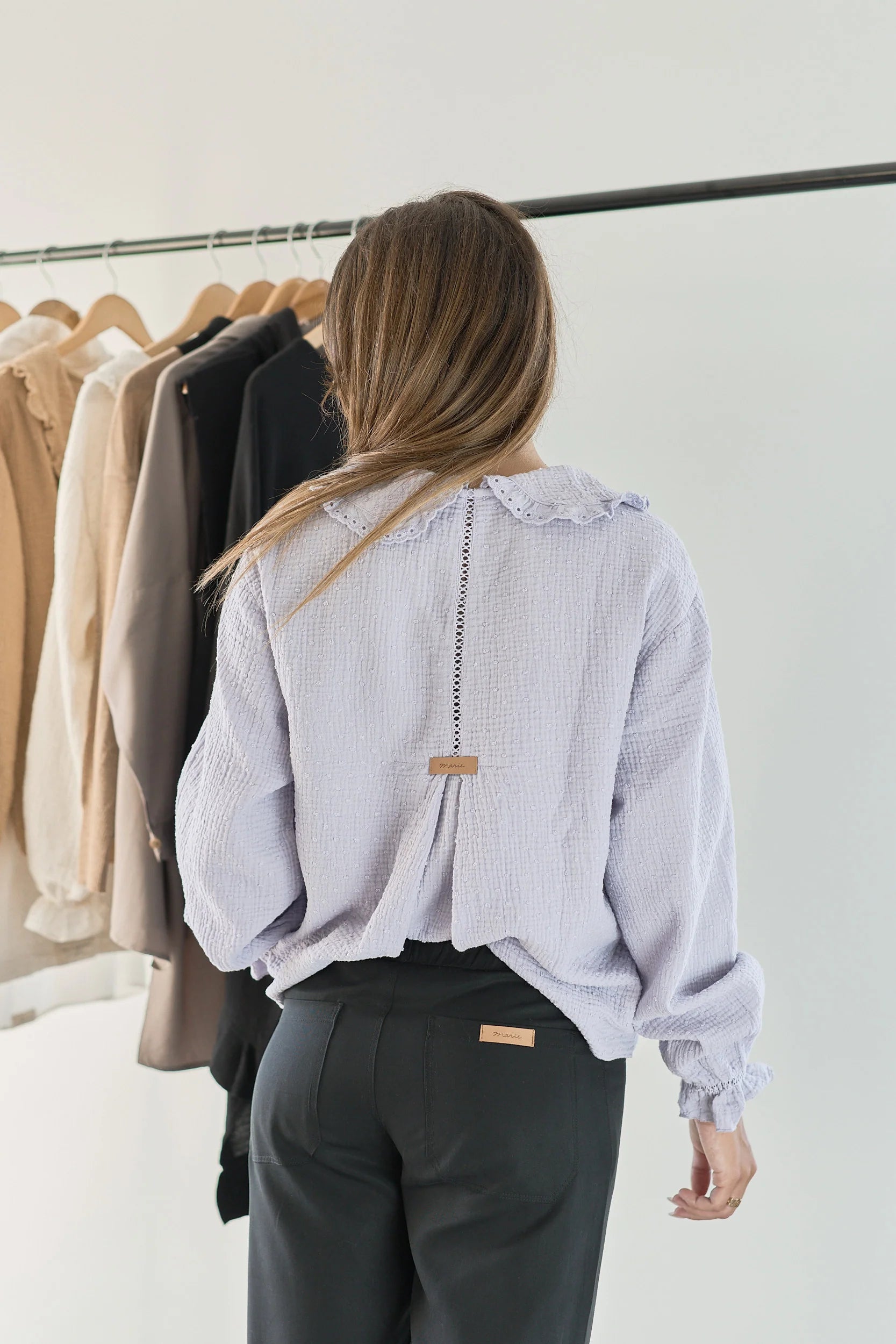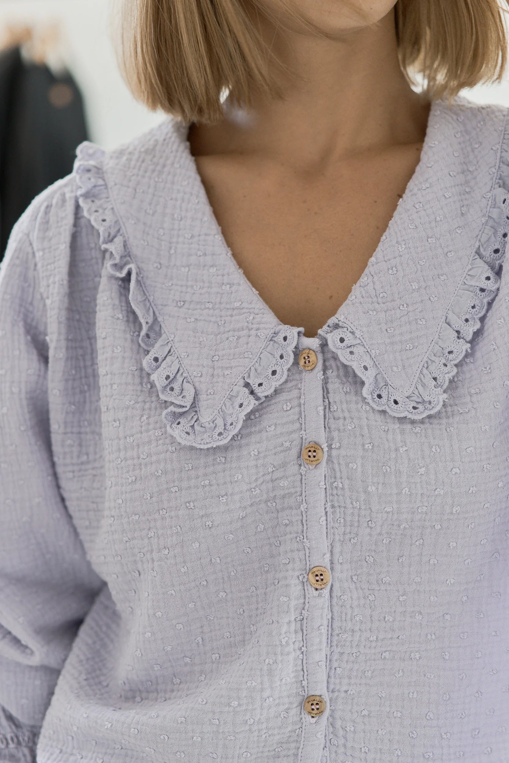 Esta camisa de bambula bordada tiene un encanto a simple vista, sus detalles como el cuello, su bordado inglés, sus puños, puntillas y la espalda hacen que cualquiera se enamore de esta pieza.