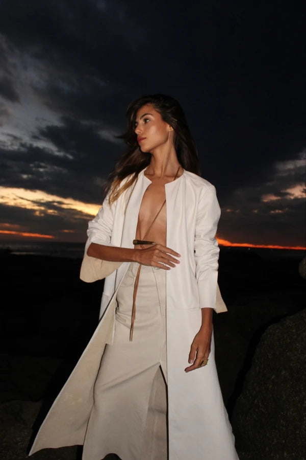 Este tapado de cuero es la prenda perfecta para quienes buscan elegancia y estilo sin renunciar a la autenticidad. Con un diseño abierto a los costados y en las mangas, aporta un aire moderno y sofisticado a tu look. El cuero utilizado en su confección es de alta calidad, retirado de la curtiembre antes de los últimos procesos químicos, lo que le da una apariencia más natural y auténtica. Las marcas naturales en el cuero hacen de cada prenda una pieza única, resaltando la belleza de un material genuino.