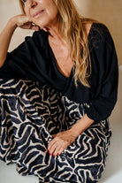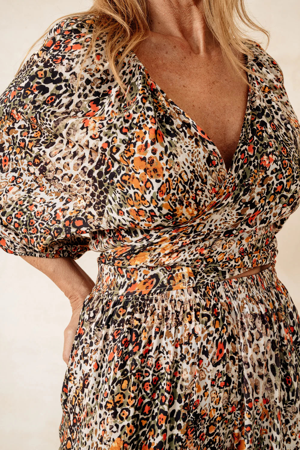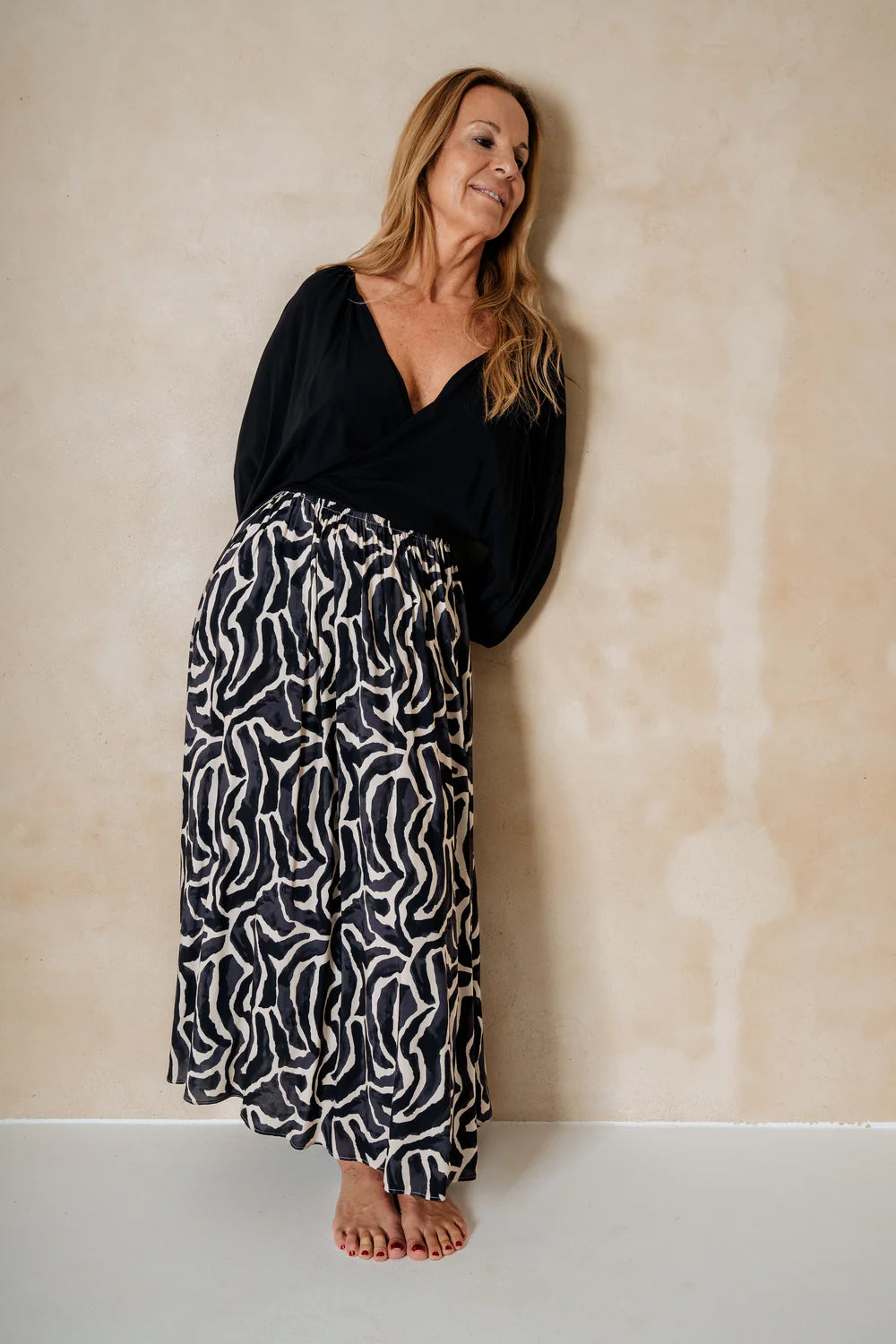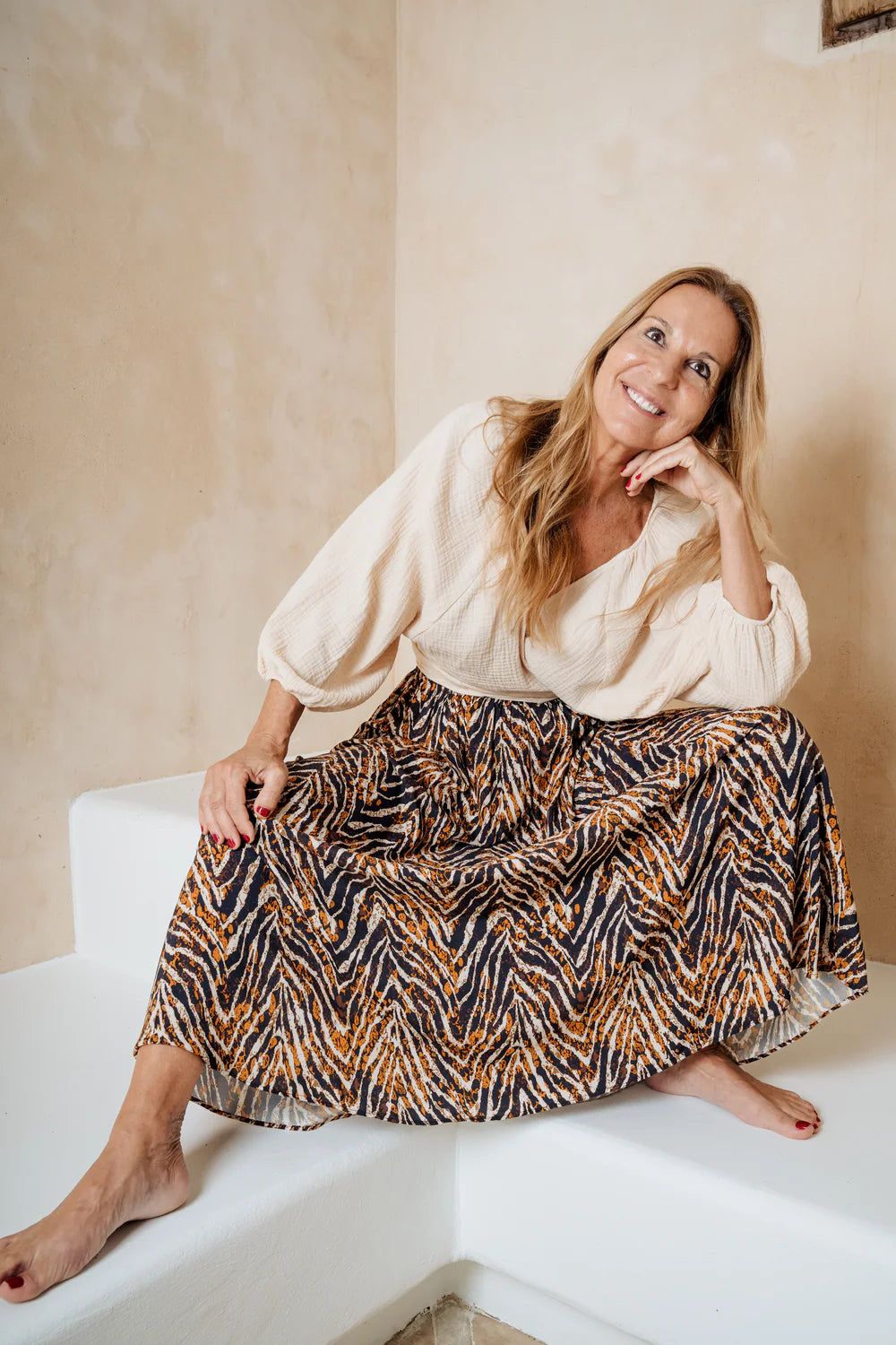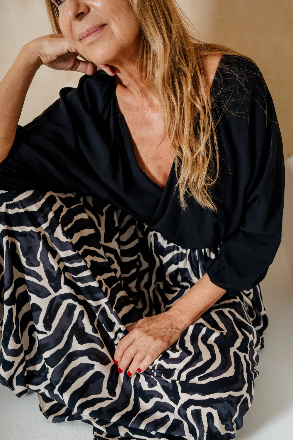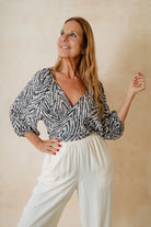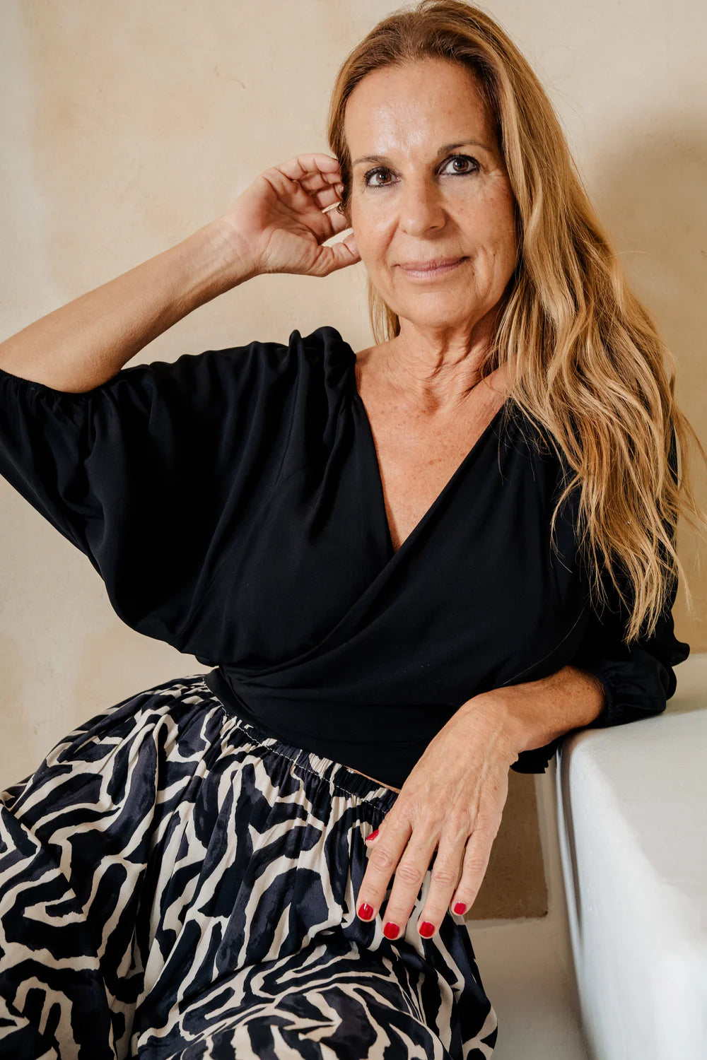 Chaqueta cruzada de manga codo con goma en el puño y sisa ranglán, adornada con elegantes fruncidos en el escote. Su diseño femenino y desenfadado garantiza una comodidad excepcional, permitiendo un cierre versátil atado por delante o por detrás. Material: Greta está confeccionada en 100% Viscosa EcoVero.