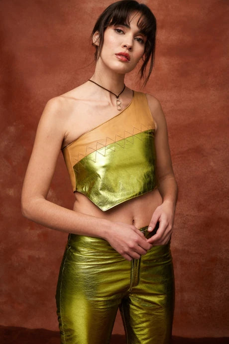 Confeccionado en un tejido de alta calidad, el Top Diagonal Pistacho Galáctico tiene un acabado suave y cómodo, adaptándose perfectamente al cuerpo con una caída fluida que lo hace increíblemente favorecedor.