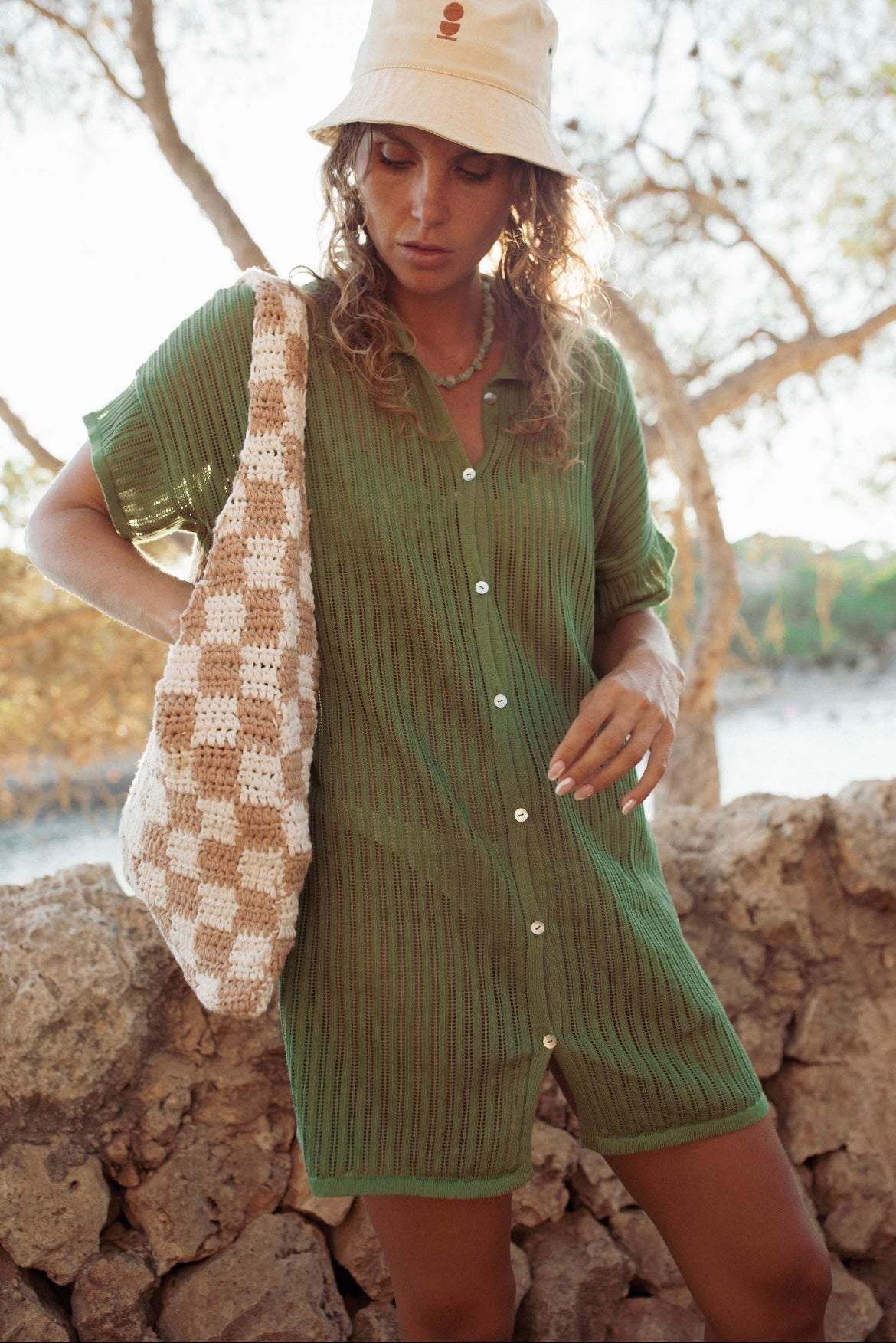 Tote Bag realizada a mano, artesanalmente con técnica crochet. Tejida a dos colores en formato cuadriculado.
