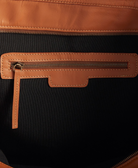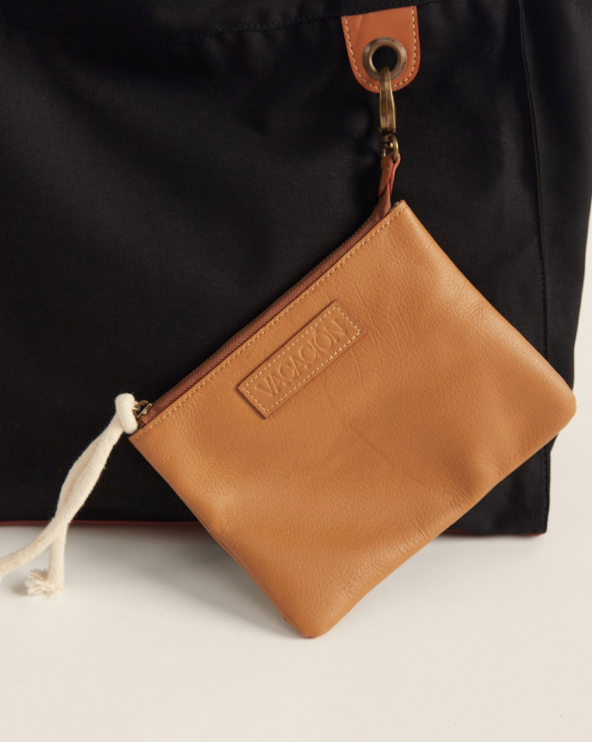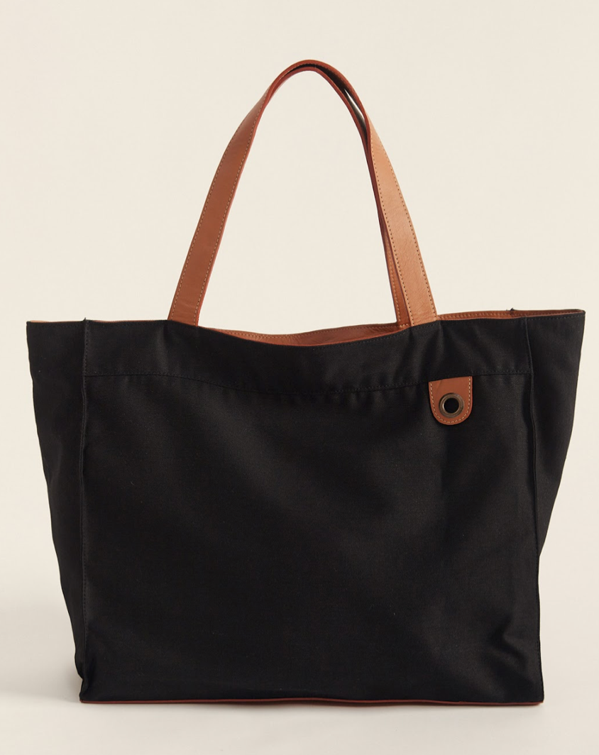 Tote bag confeccionada con fibras naturales y detalles en cuero.