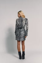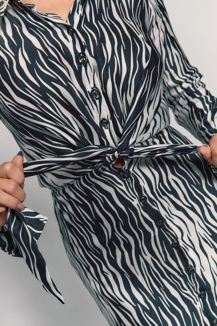 Vestido corto camisero con estampado animal print, de rayas tipo cebra en colores blanco y negro. Tiene un diseño clásico de camisa con botones en la parte frontal, cuello de solapa y mangas largas con puños abotonados.