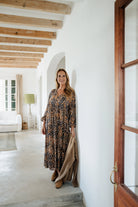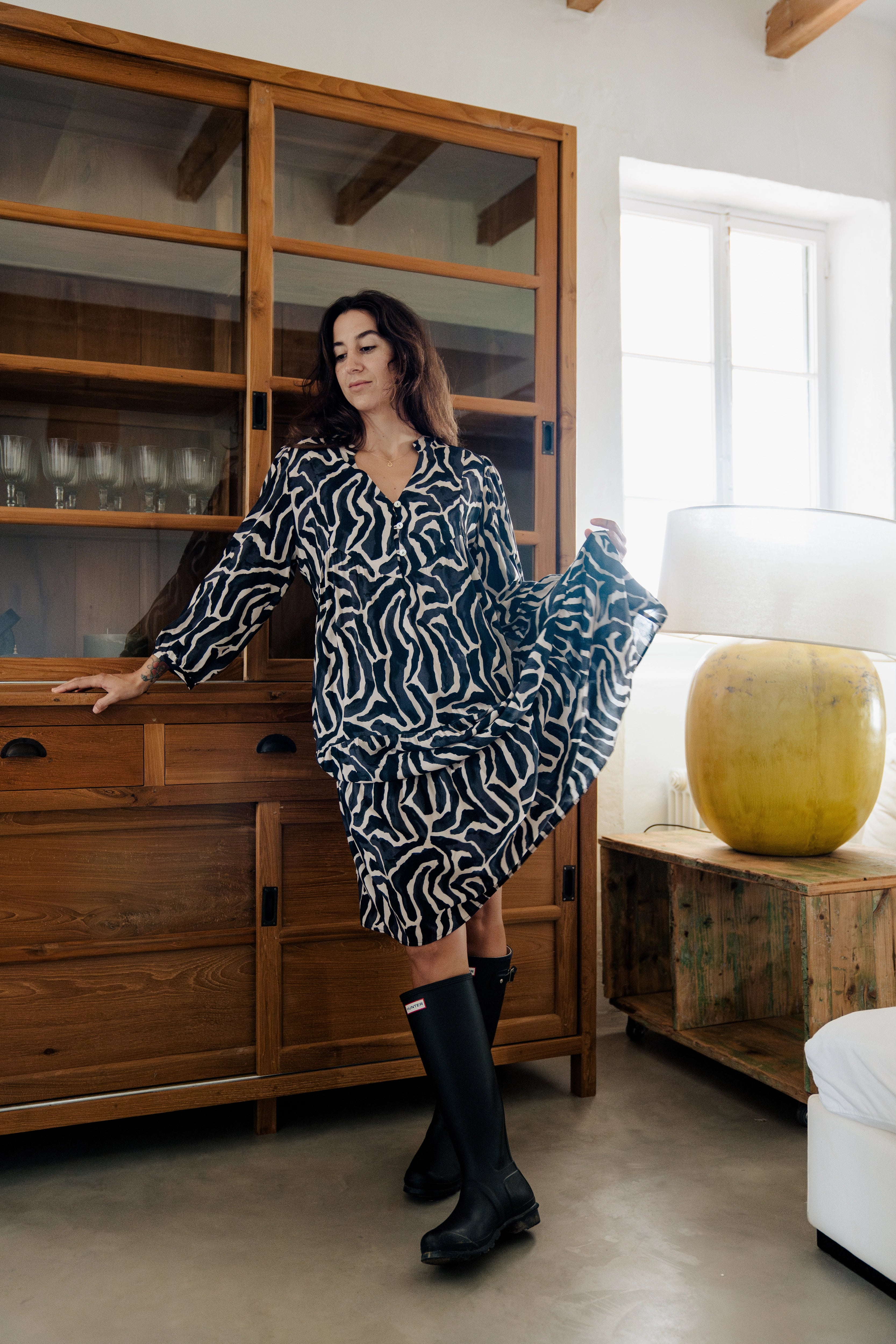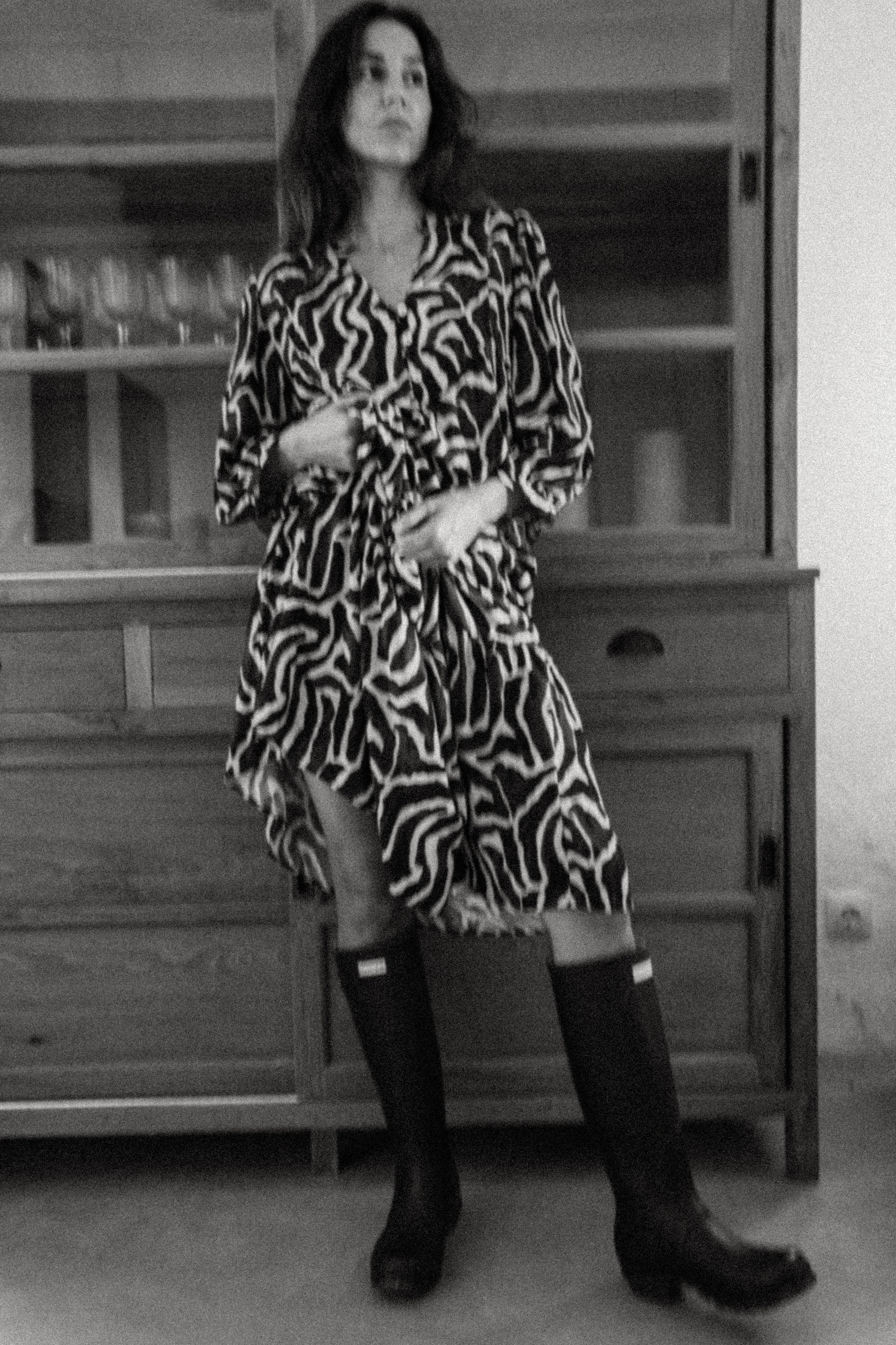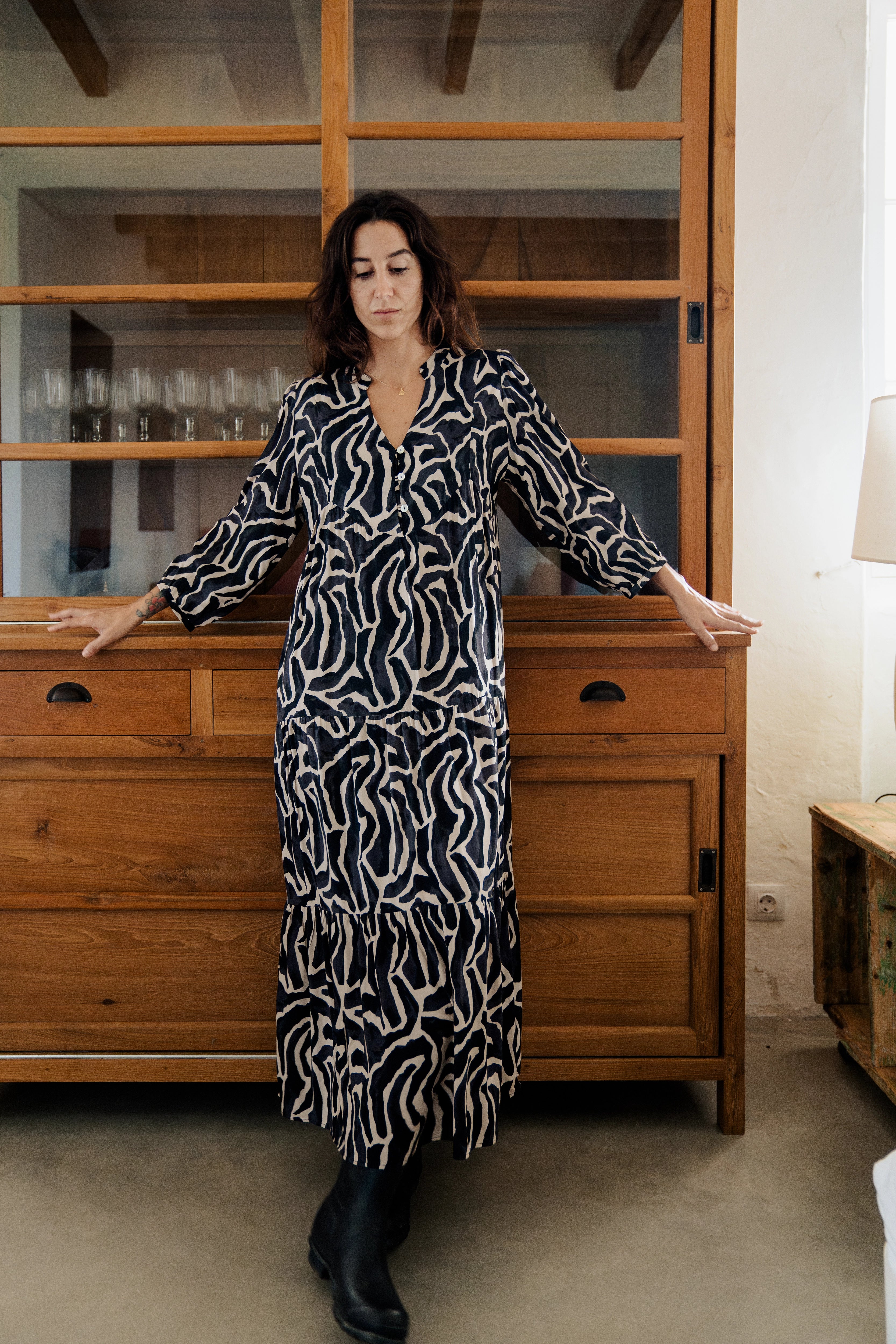 Vestido midi con cuello mao acabado en pico, manga larga y volante en el bajo. Vestido elegante midi con cuello Mao acabado en pico y delicada pechera adornada con botones de nácar. De manga larga y un volante en la parte baja aportan movimiento y fluidez, realzados por un tejido suave y ligero de viscosa estampada. Materiales: 100% en Viscosa EcoVero. Esta viscosa deriva de la pulpa de la madera de los árboles y es biodegradable. Su producción y la cadena de suministro es transparente y cumple altos estándares medioambientales. Cuenta con Certificado OEKO-TEX. Detalles únicos: Estampado cebra de diseño propio, confeccionado en España en unidades limitadas.