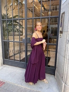 Vestido largo de gasa color vino con tirantes finos y un corte fluido que cae suavemente. Incluye un chal a juego que complementa el conjunto.
