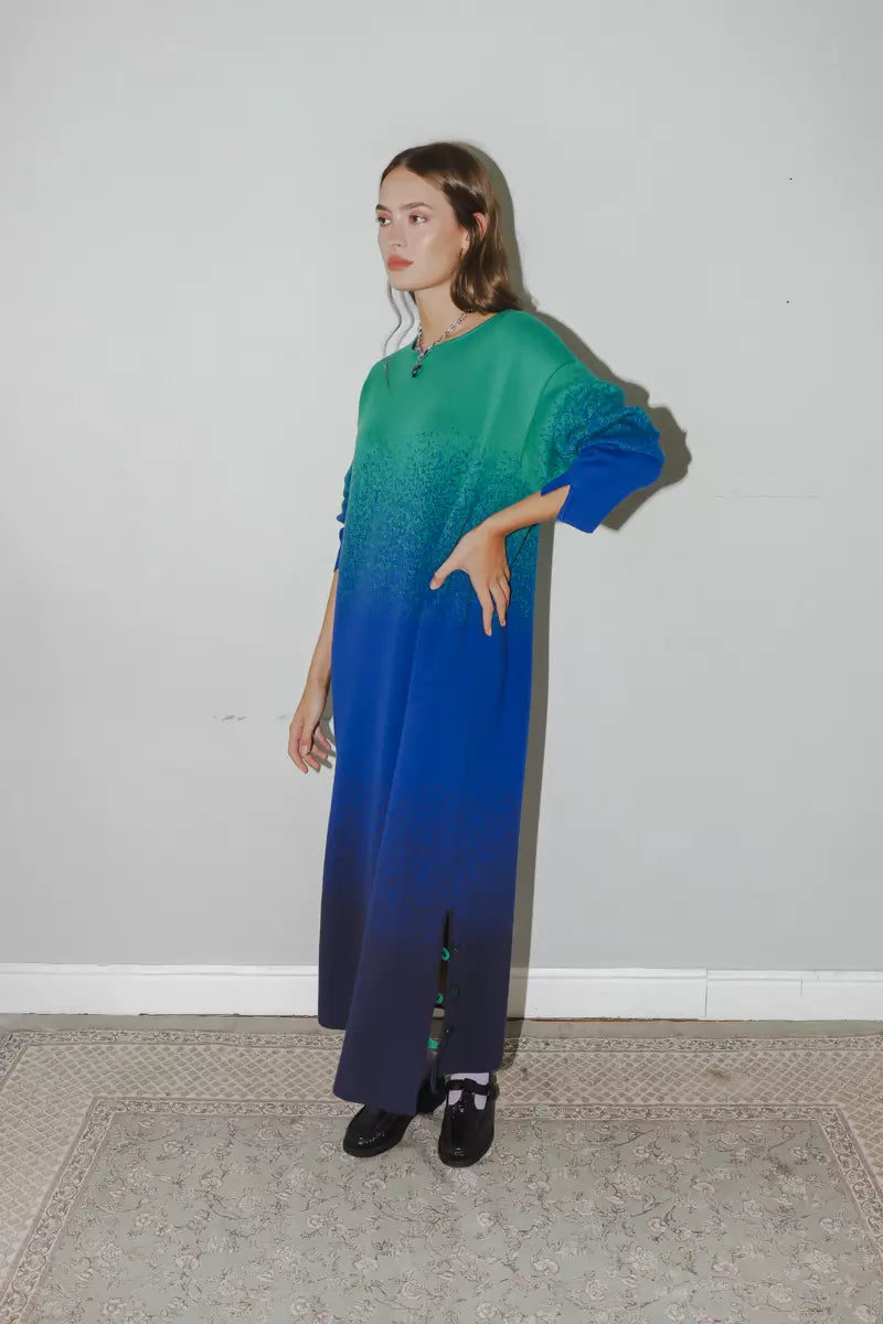 Este vestido de manga larga con apertura en los costados es una prenda elegante y versátil, ideal para cualquier ocasión. Diseñado y tejido en Uruguay, combina comodidad y estilo con una caída fluida y un ajuste favorecedor.