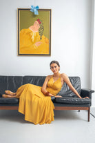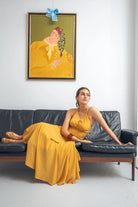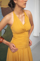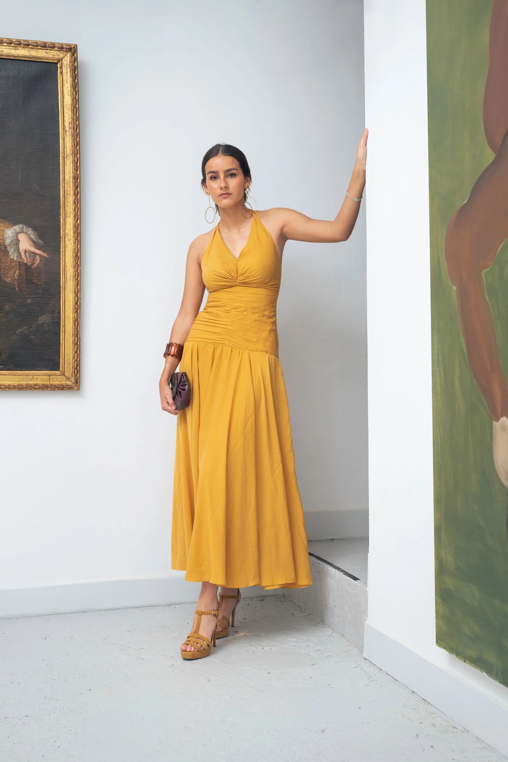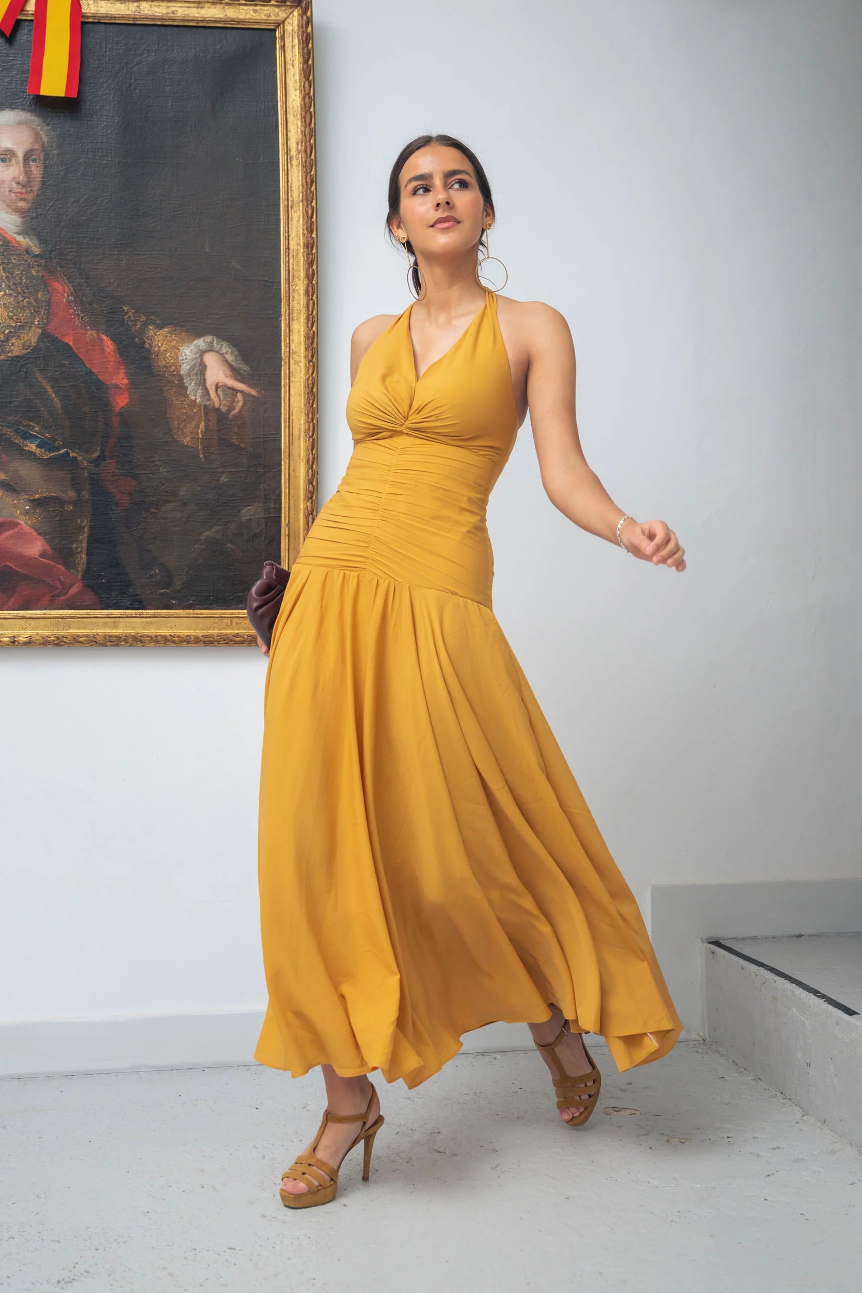 Con un diseño de tirantes finos que se anudan al cuello, resalta los hombros y el escote. La cintura fruncida define la silueta, mientras que la falda larga y fluida permite movimiento en cada paso.