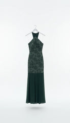 Vestido pegado con estampado floral en coral y verde, con acabado en gasa.