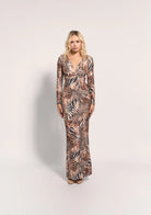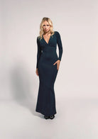 Vestido largo y ajustado, con mangas largas, escote profundo en V. Lleva doble tela en el pecho, detalle de espalda descubierta y fruncido, y abertura en la parte trasera. El diseño resalta la figura y es ideal para eventos formales o nocturnos.