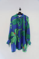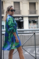 Vestido con cuello y manga acordonado de seda diseñada y estampada en Uruguay.