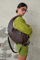 Bolso de piel de vacuno granate en forma de D. Viene con un asa lisa para poder llevarlo cruzado o al hombro.