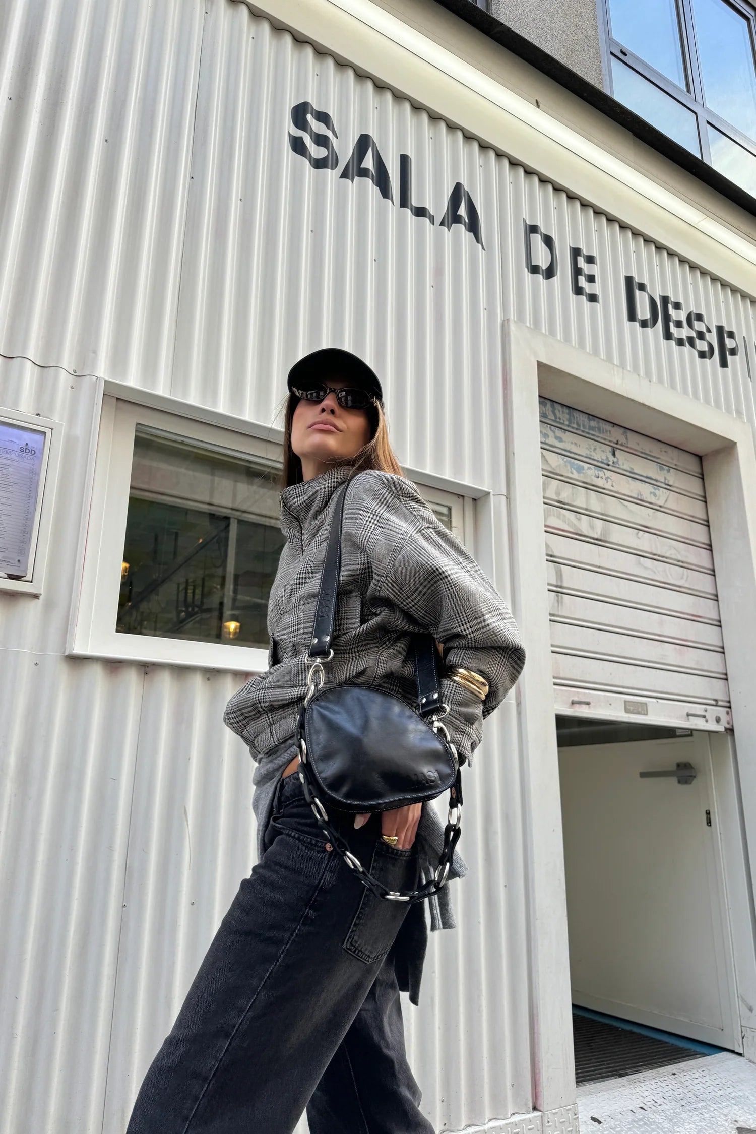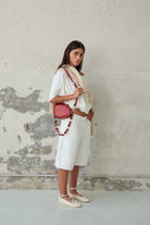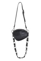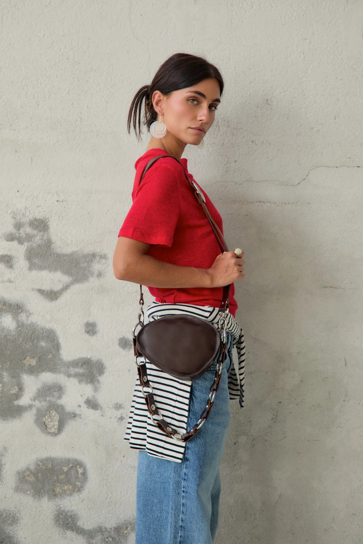 Bolso de piel de vacuno granate en forma ovalada. Viene con un asa lisa y otra de circulos para poder llevarlo cruzado. El asa lisa es ajustable quitando eslabones de la cadena. Este bolso viene del agujero del D bag por lo que se reutiliza toda la piel.