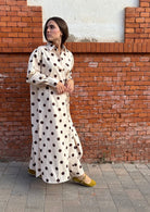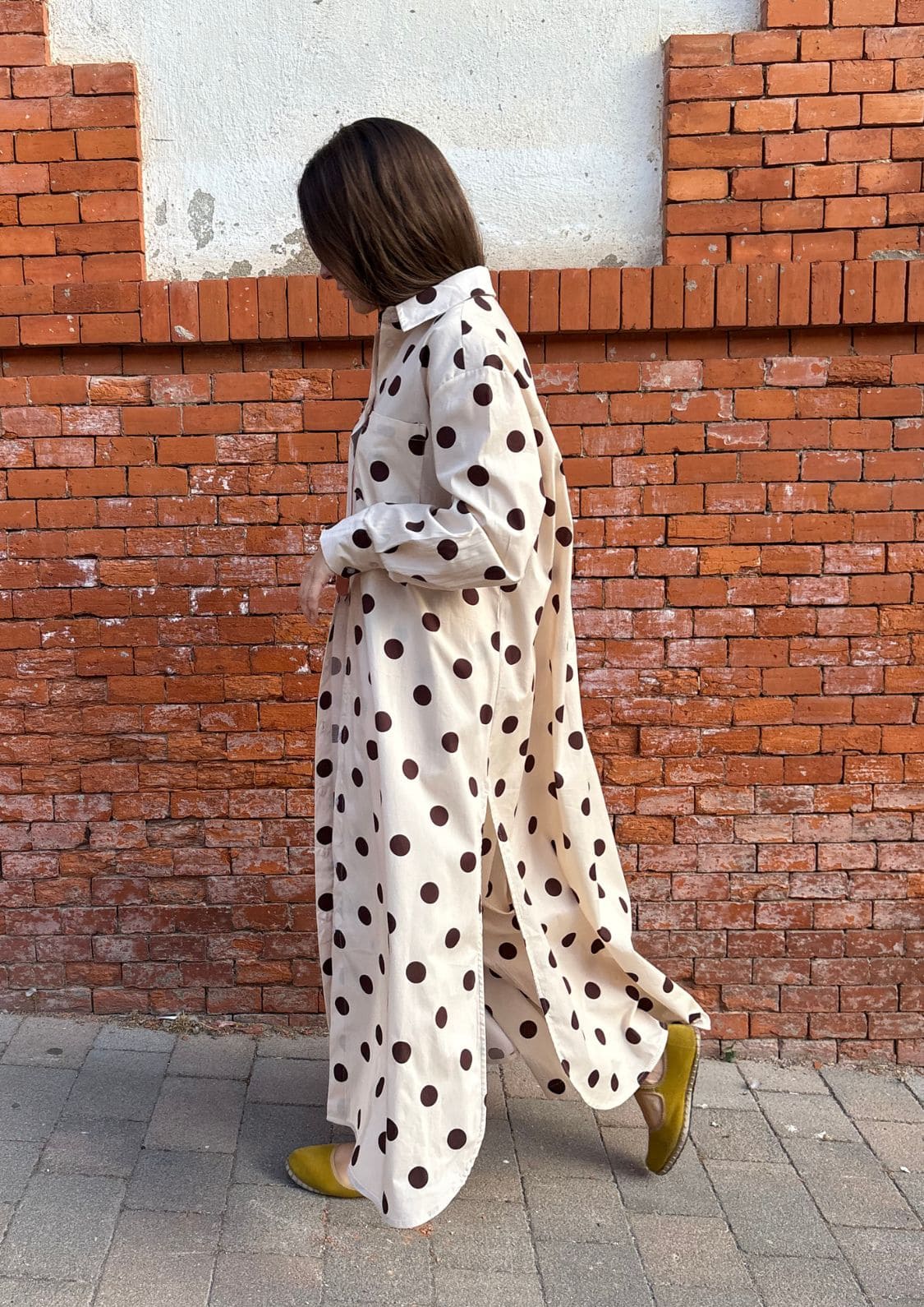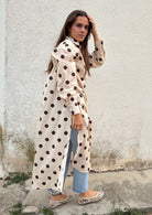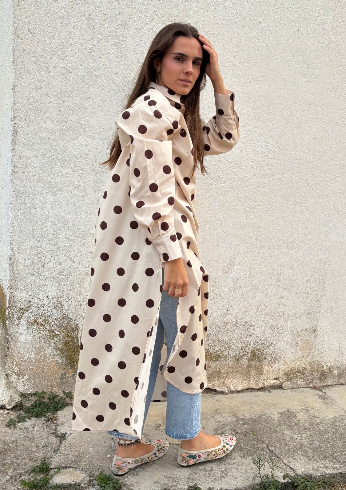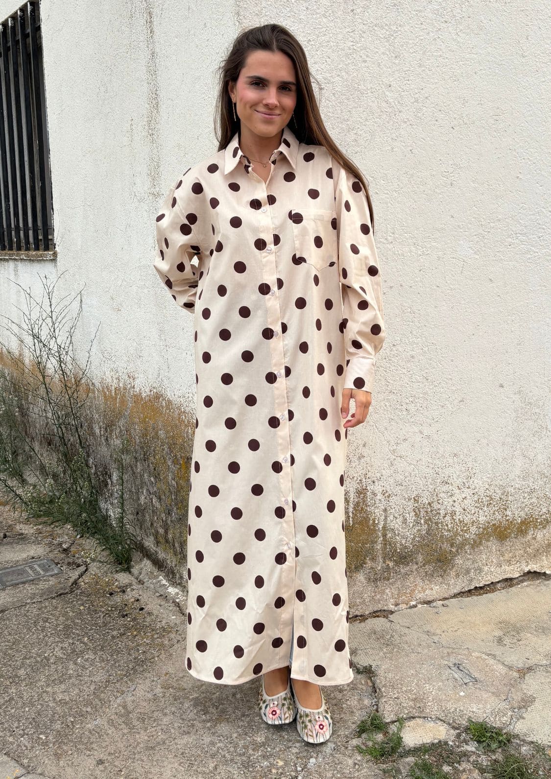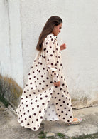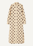 Un diseño versátil y atemporal que combina comodidad y sofisticación. Este vestido camisero maxi, confeccionado en un tejido ligero y fluido, presenta un estampado de lunares en tonos beige y marrón.