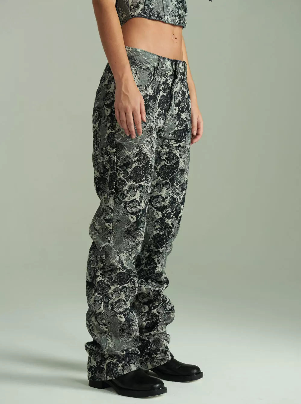 Tiro alto y un fit ancho, desde la cintura hasta el final, que termina en un súper dobladillo. Tiene cierre y botones invisibles en el interior. La cinturilla es del mismo estampado.
