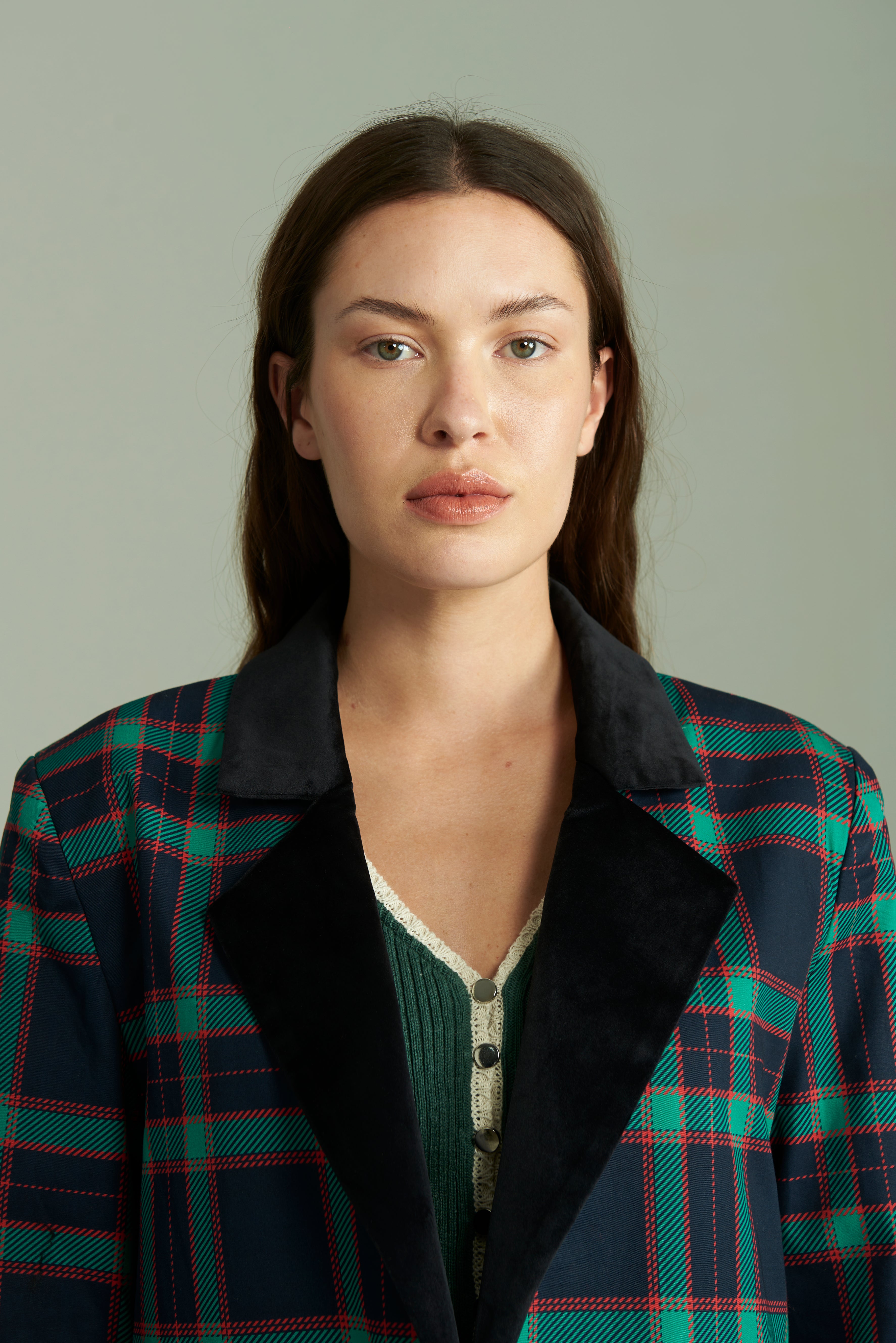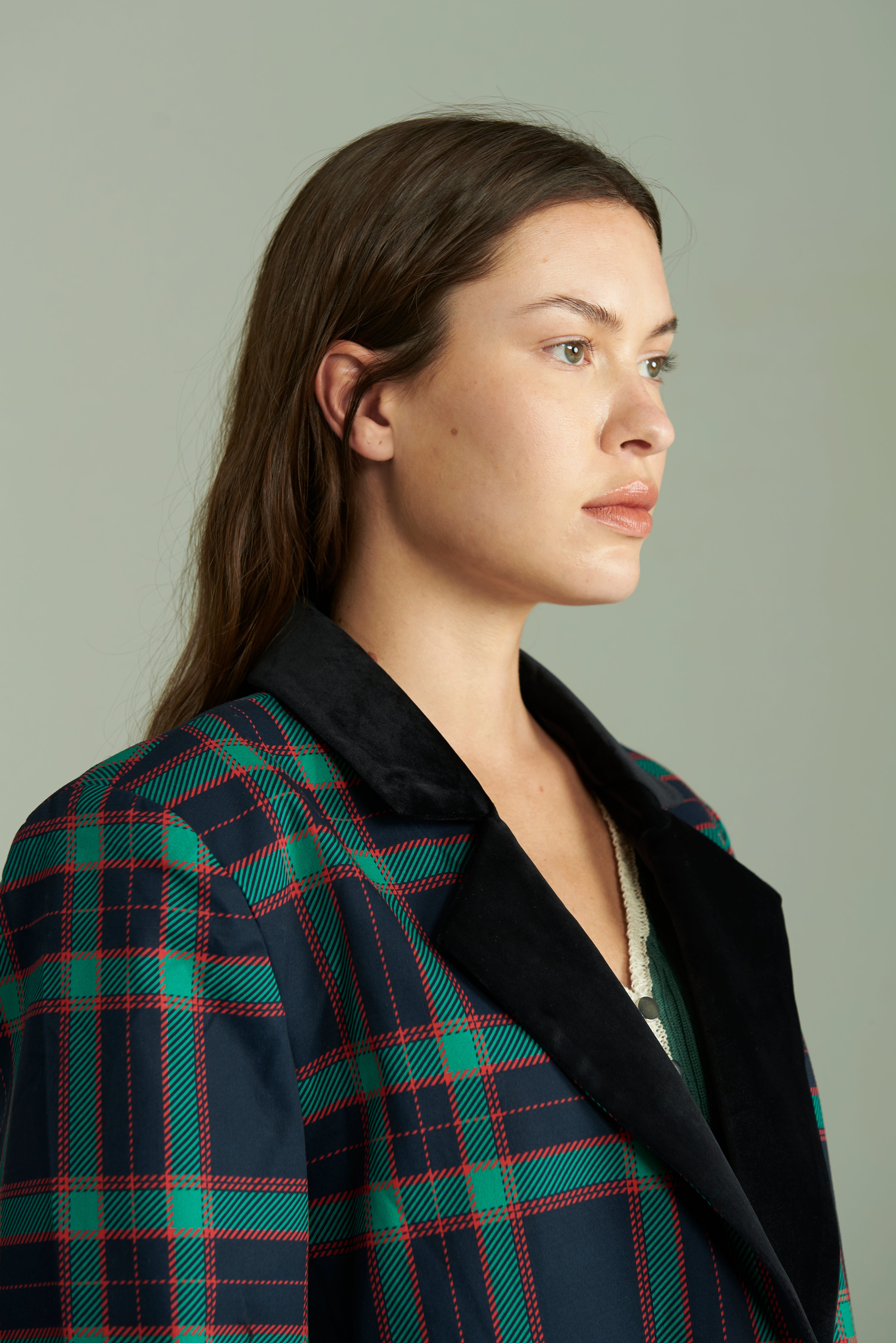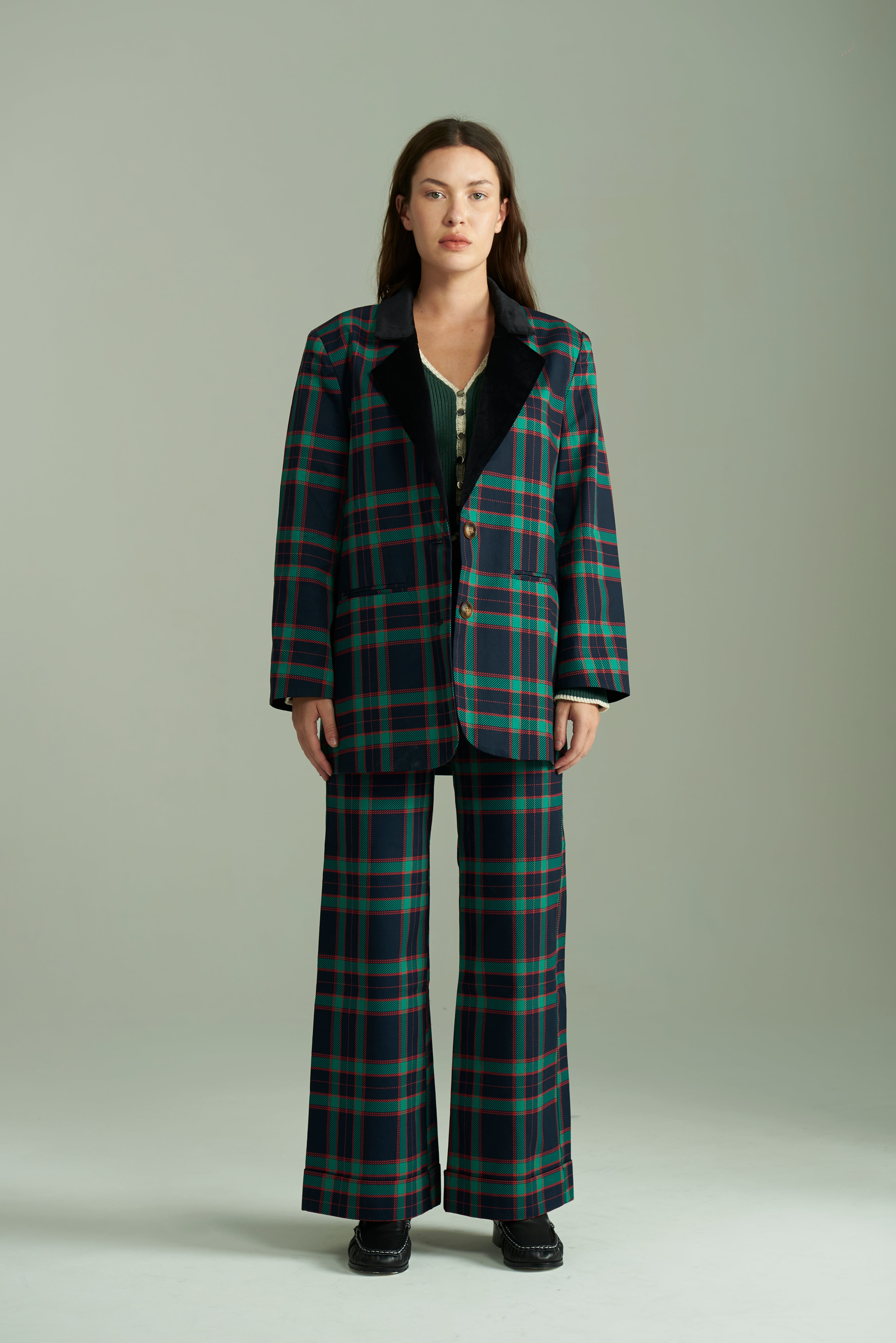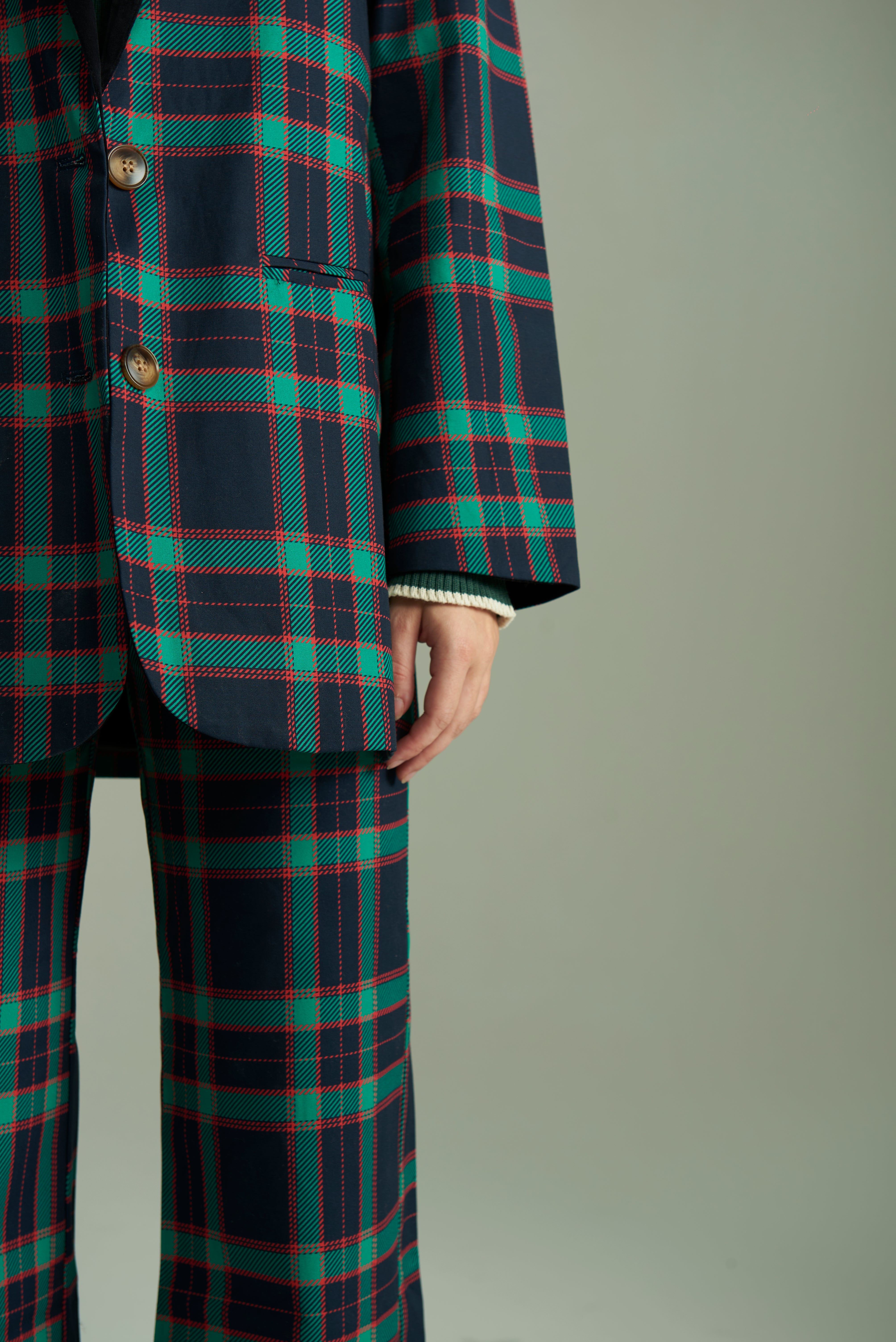 Diseñado en estampado cuadrillé de arriba abajo, a excepción por el cuello aterciopelado en negro, para romper con la monotonía. En la parte delantera tiene dos bolsillos para que no tengas que tapar el conjunto con ninguna cartera, y dos botones para prenderlo. Por dentro forrado en satén.