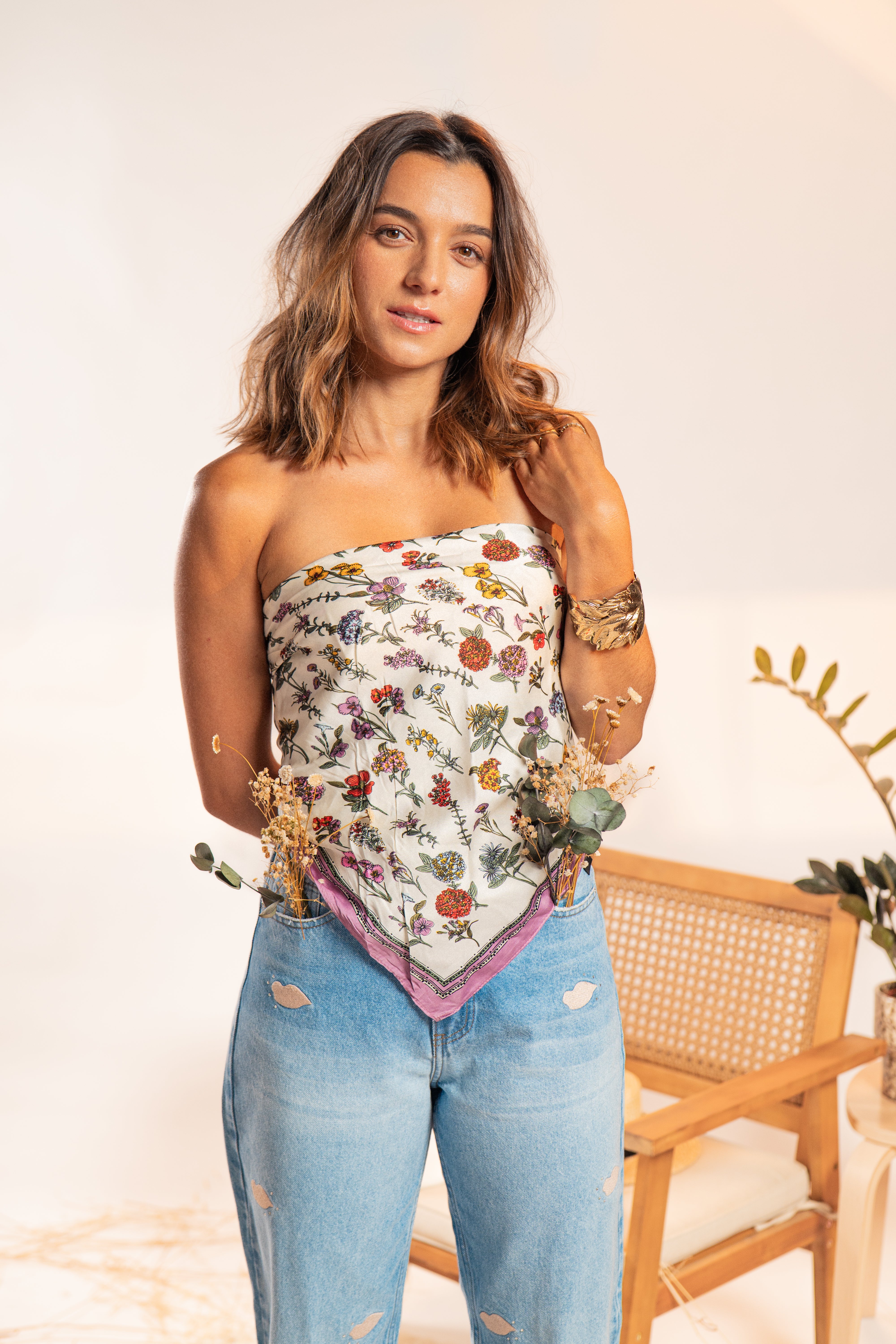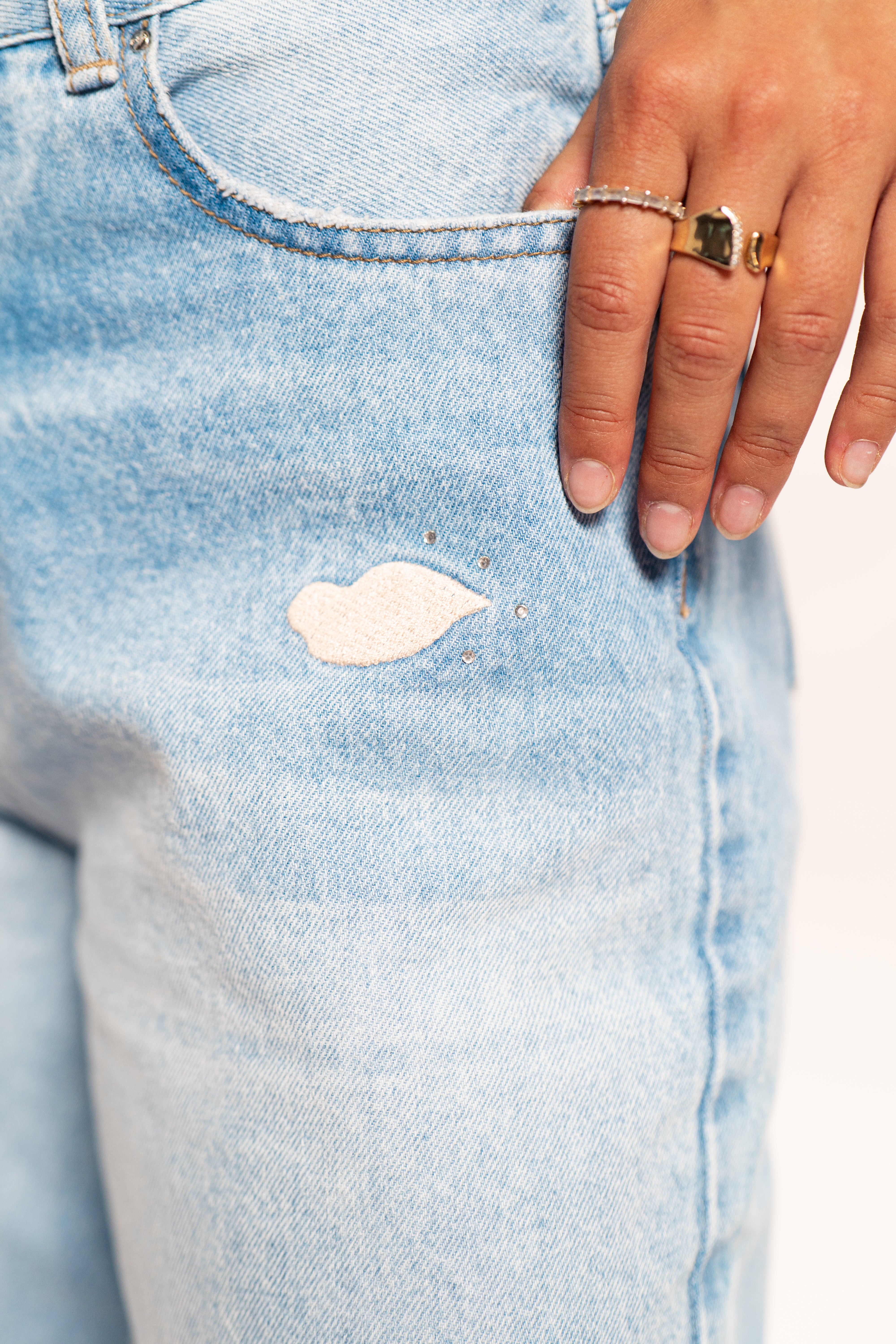 Confeccionado en tela 100% algodón rígido, en estilo mom, ofreciendo una estructura firme, cómoda y con un tacto natural. Su silueta clásica de tiro alto y pierna recta brinda un ajuste relajado y favorecedor. Como detalle distintivo, incorpora pequeños bordados de besos enla parte delantera con apliques brillantes adhesivos, que aportan un toque artesanal y original sin perder la esencia minimalista del denim.