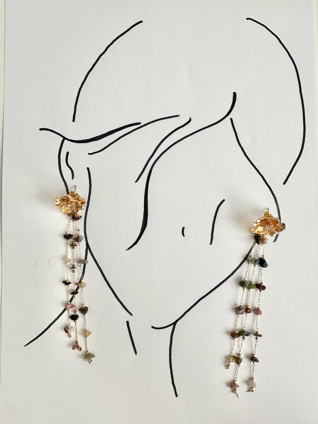 Pendientes de flor irregular con circonita y cadenas bohemias de piedras tonos verdes