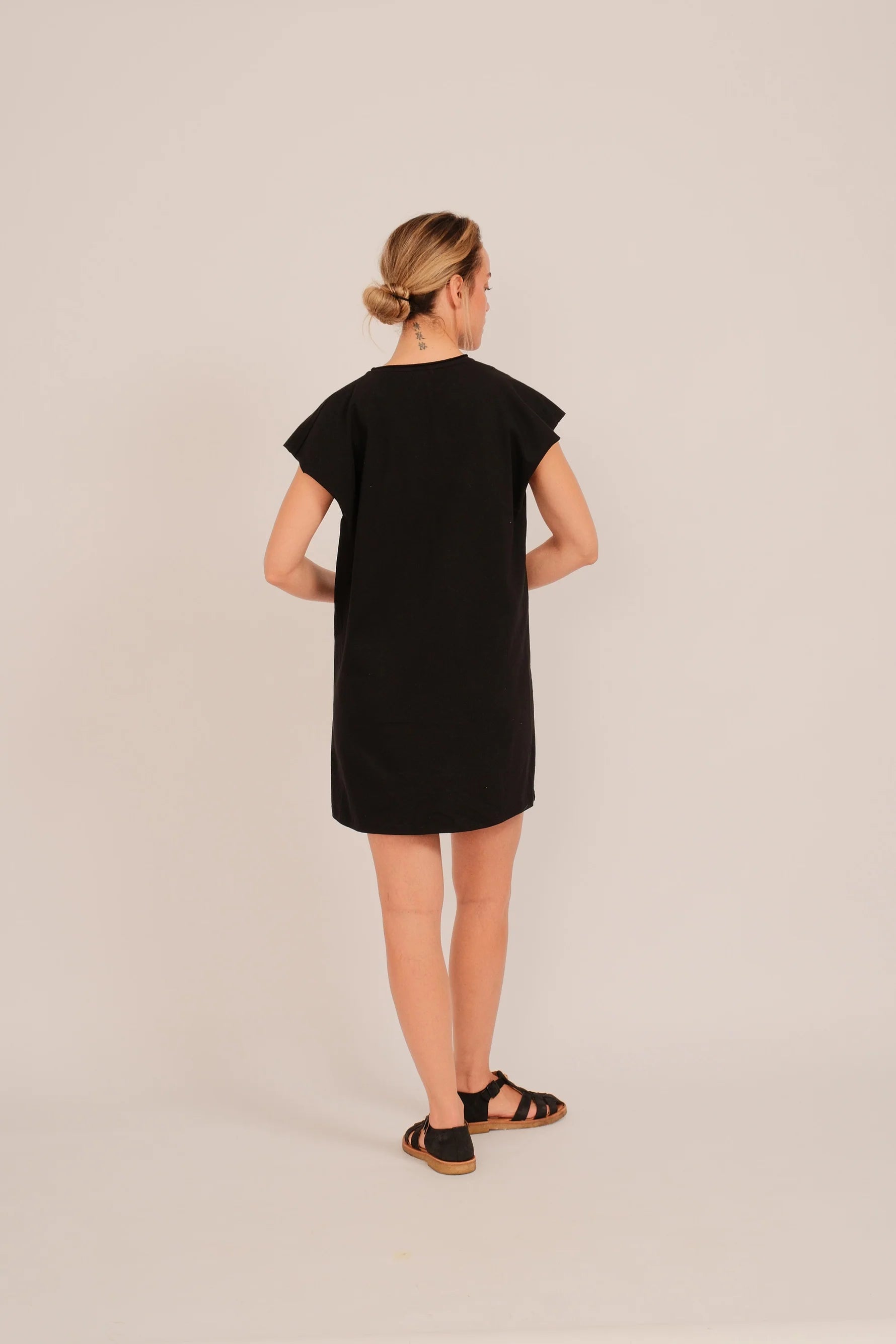 Este vestido ha sido pensado para acompañarte en tu rutina con la suavidad del algodón y la libertad de una silueta relajada. El diseño de los hombros le da un toque de forma y presencia sin perder ligereza, sumando ese pequeño gesto de estilo que transforma lo simple en especial.