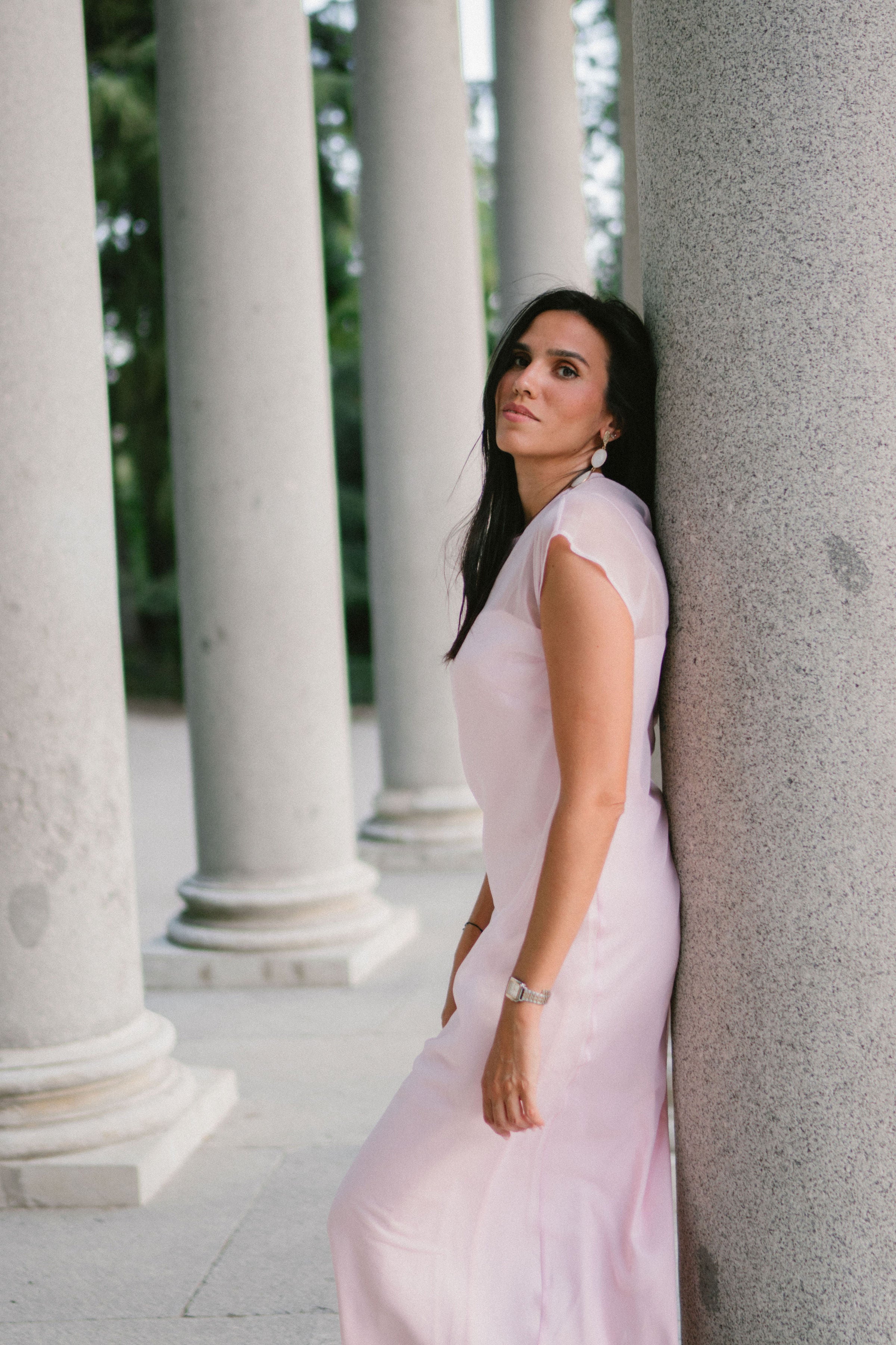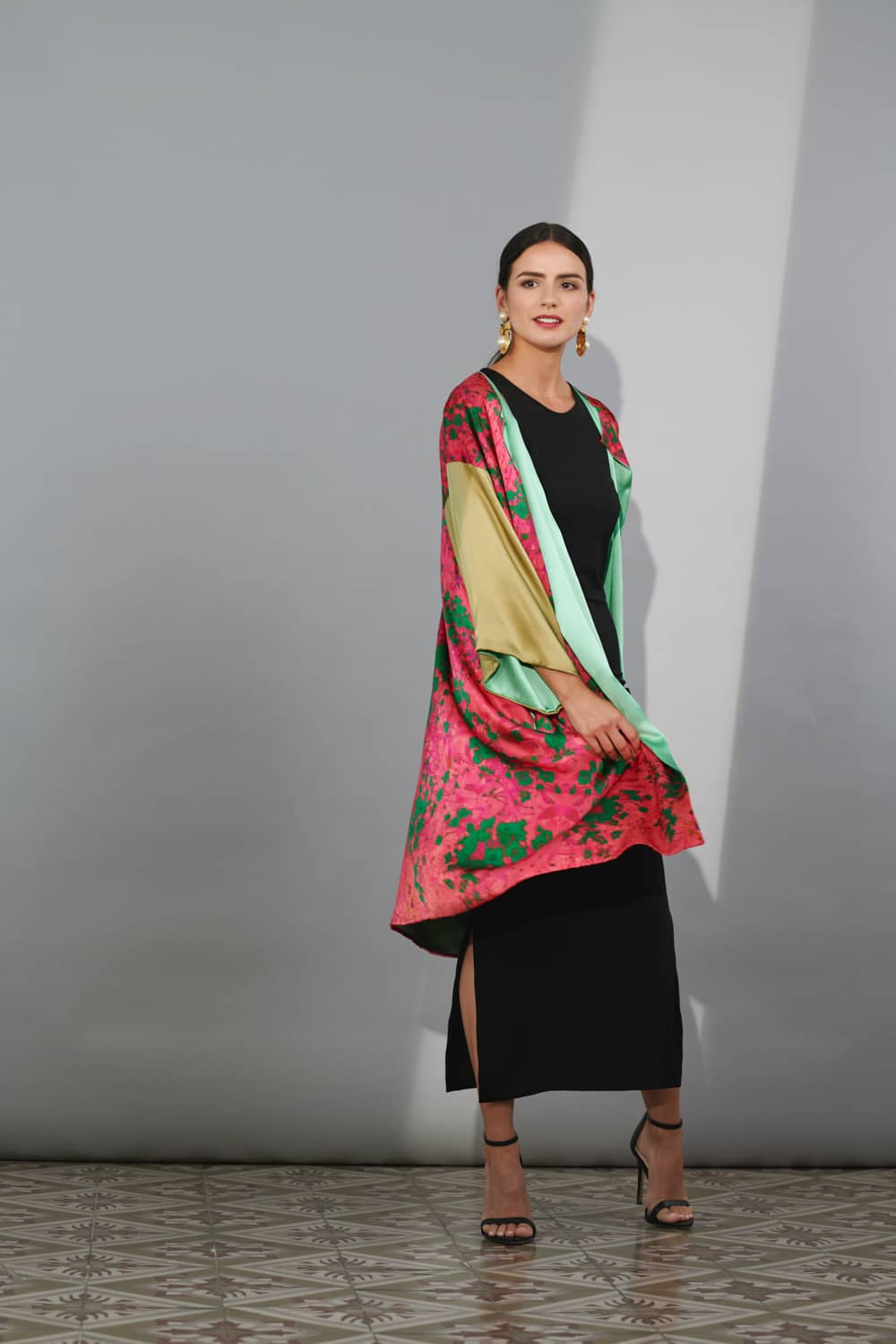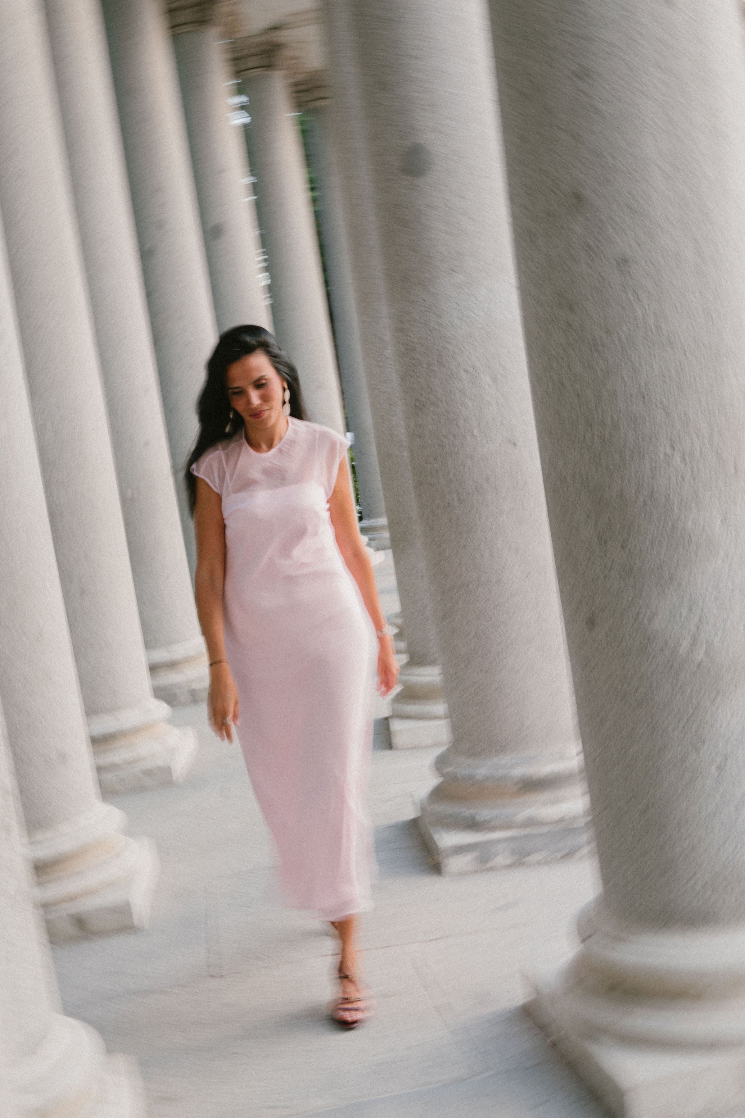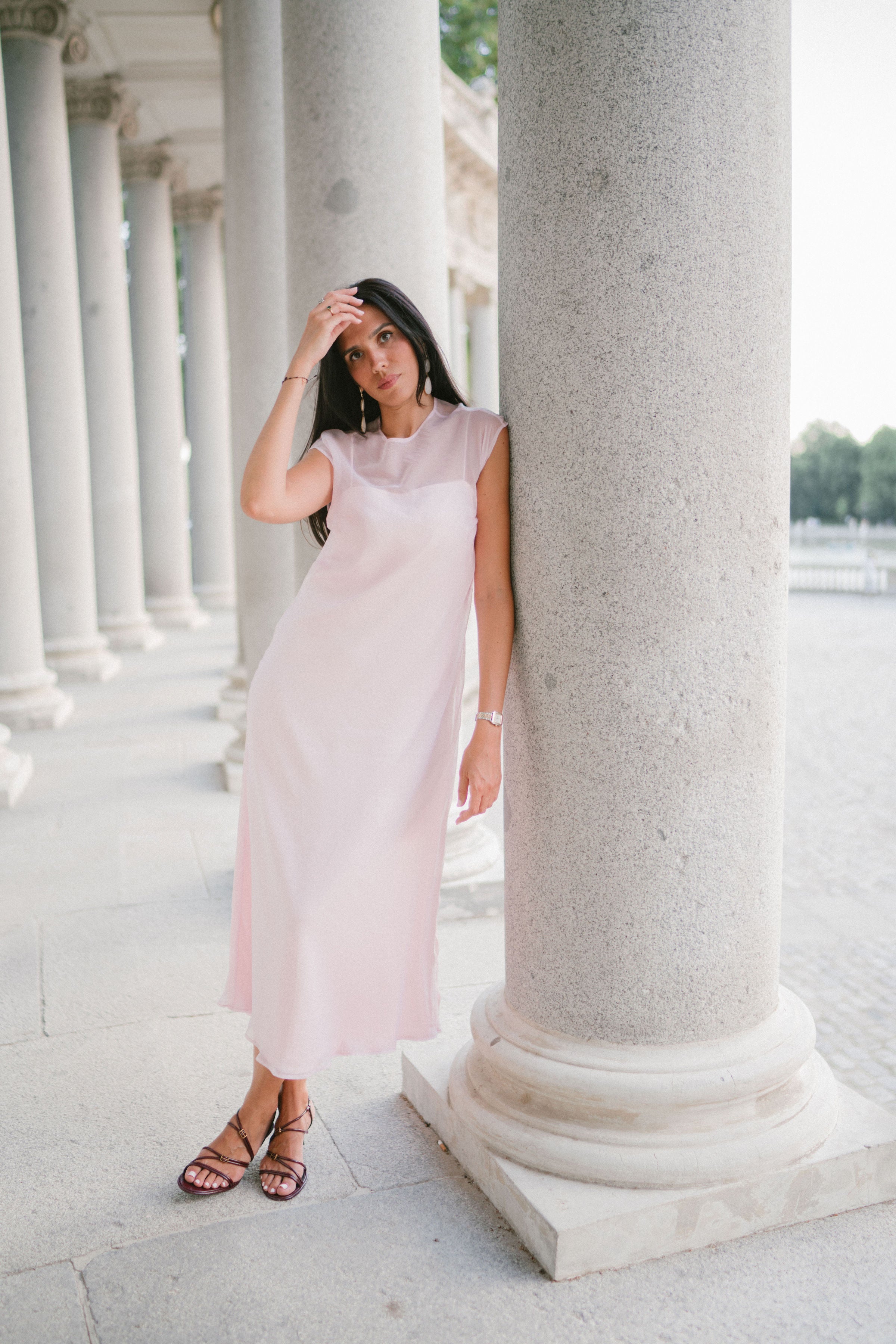 VESTIDO ROSA SATINADO CON CAPA EN ORGANZA