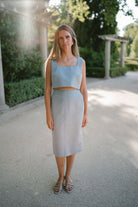Top estructurado en color azul bebé, diseñado para complementar la falda de satén a juego o para dar nueva vida a otras prendas de tu armario. Totalmente forrado para mimar tu piel y con cierre de cremallera en la espalda. Las costuras reforzadas garantizan que mantenga su forma, realzando la silueta con elegancia y suavidad.