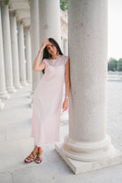 Un conjunto que se transforma contigo. Vestido lencero satinado de tirantes, suave al tacto y con caída fluida, cubierto por un delicado vestido de organza en tono rosa maquillaje. La organza, de largo sutilmente mayor, crea un juego de texturas y volúmenes, y se cierra en la espalda con un botón forrado. Puedes llevar ambas piezas juntas o por separado, multiplicando las posibilidades.