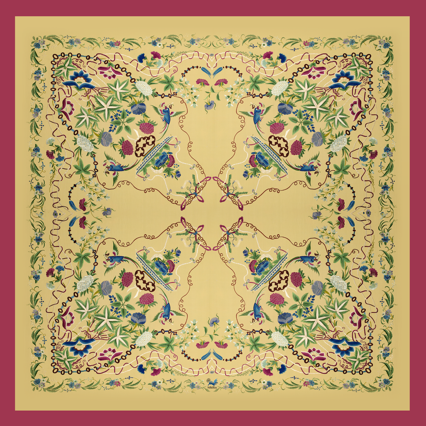 Flores blancas, burdeos, azules y verdes y bambúes configurando una silueta de jarrón con cintas que rematan en el centro del campo de fina seda color caña.
