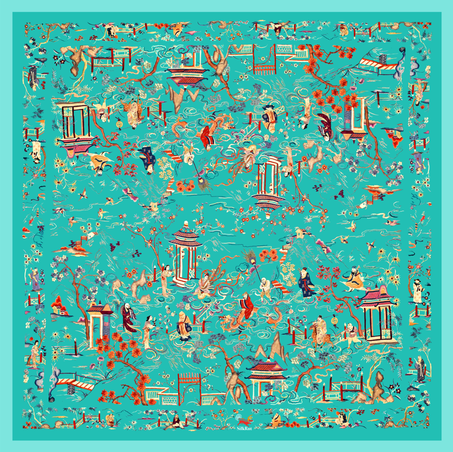 PANUELO 140 X 140 EN SEDA 100% TWILL CON DISENOS DE MANTONES DE MANILA ANTIGUOS