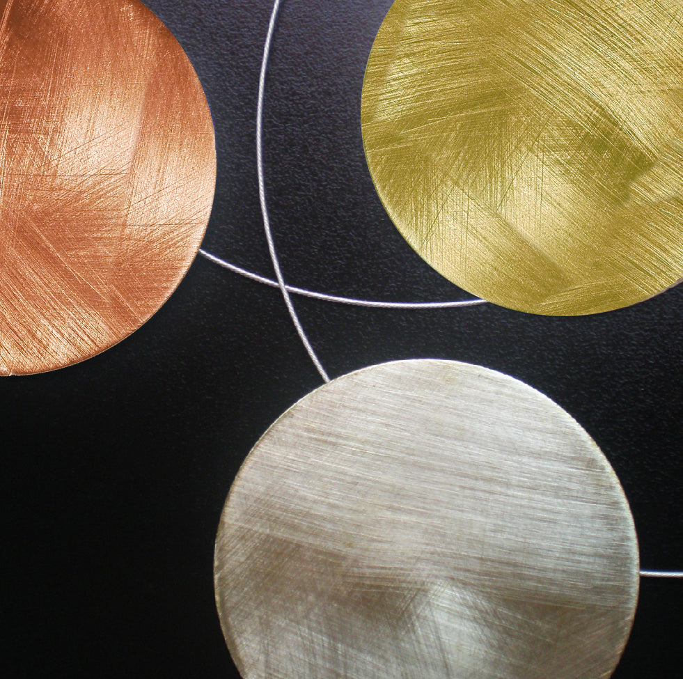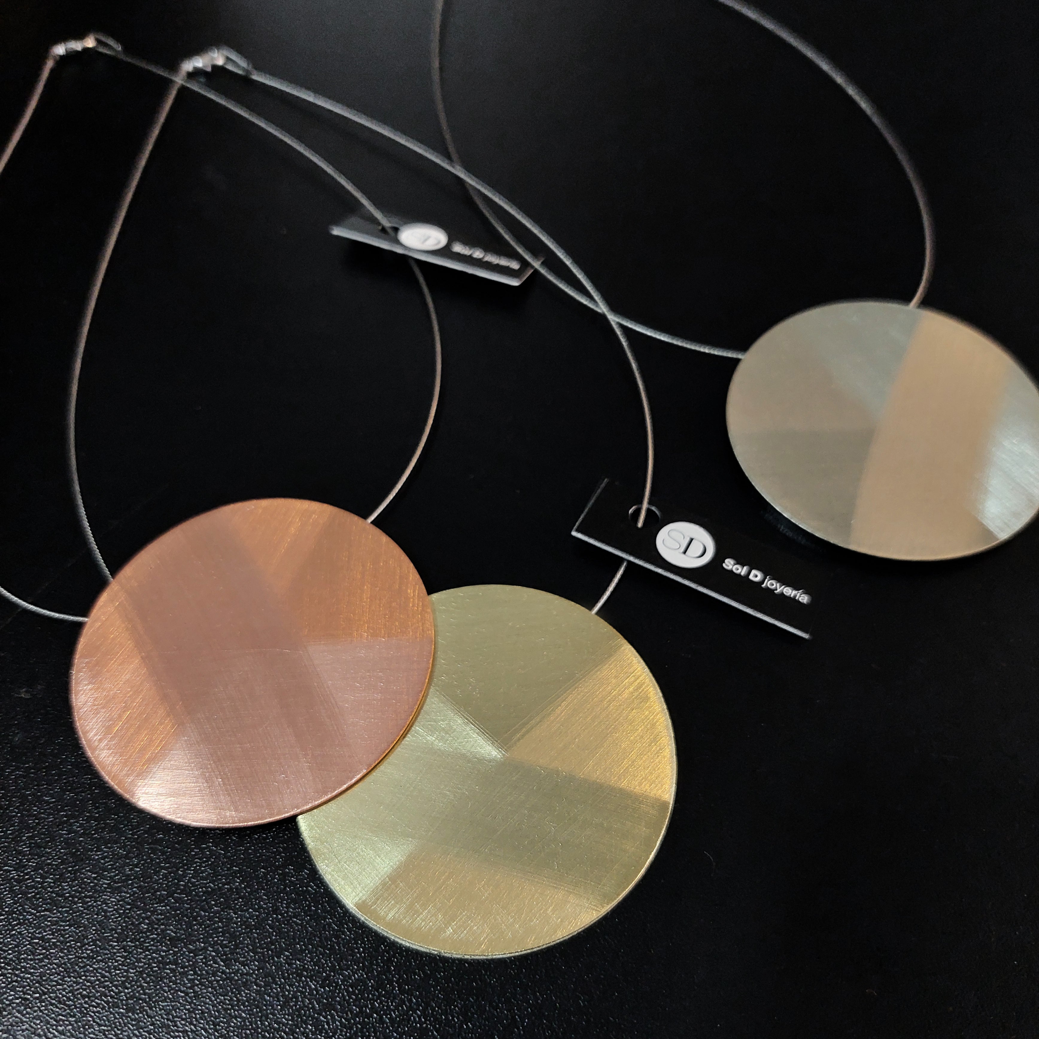 Collares REVERSIBLES. Textura realizada a mano, característica de la marca. Todas las piezas están laquedas, logrando una terminación brillante y duradera. Tanza de acero inoxidable de 46 cm de largo