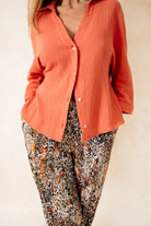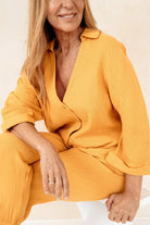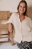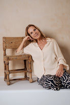 Camisa elegante y cómoda con cierre de botones de nácar, cuello camisero en "V" y mangas codo con vuelta en el puño. Materiales: Kia está confeccionado en gamuza de algodón 100% Oekotex , se caracteriza por su suavidad, durabilidad y sostenibilidad. Este material, libre de sustancias nocivas, ofrece un acabado lujoso y una textura agradable al tacto, ideal para prendas que buscan combinar estilo y respeto por el medio ambiente.
