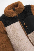 La Sudadera Travel tiene cuerpo de corderito en bloques de color marrón, negro y beige, con cuello alto, cierre de cremallera frontal y bolsillo con cremallera en el pecho. Lleva parche con logo en una manga. Composición: 100% poliéster.