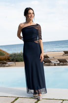 Vestido largo palabra de honor con una sugerente abertura lateral que juega con las transparencias. Aplicación de chal.