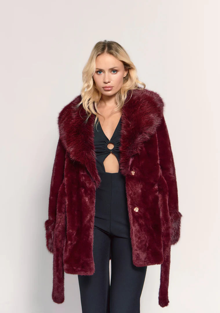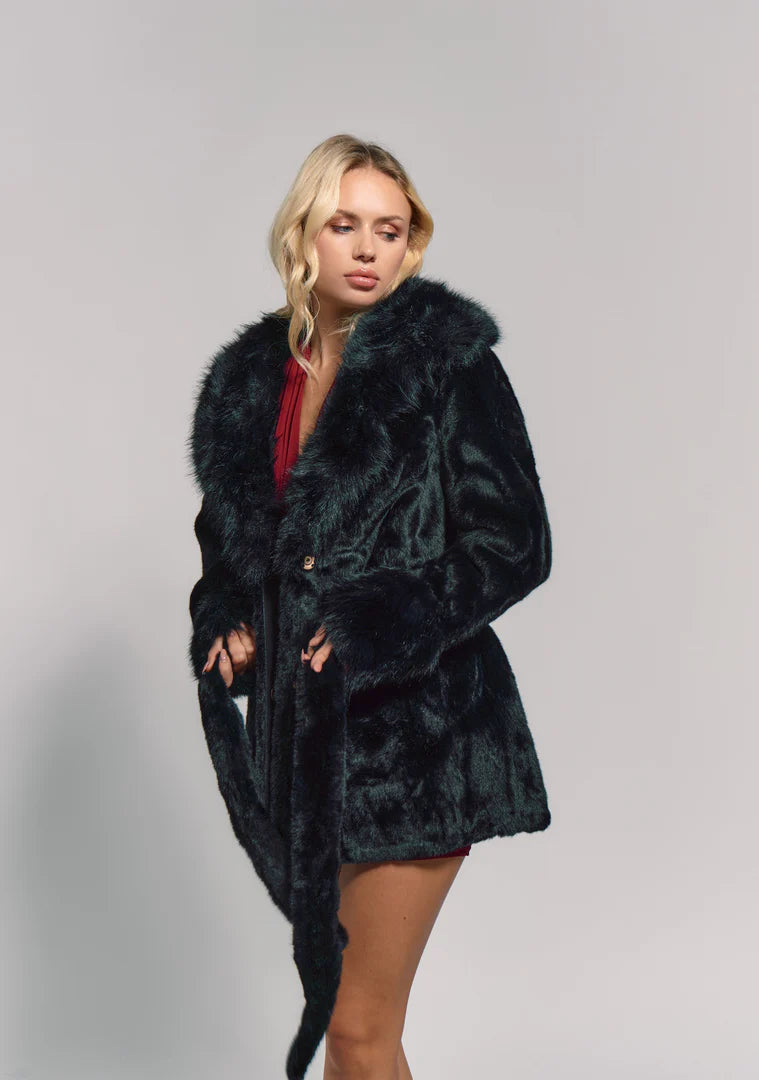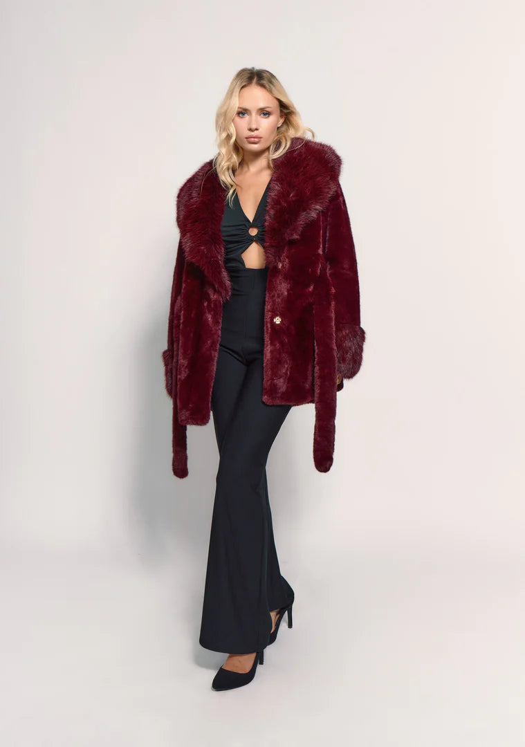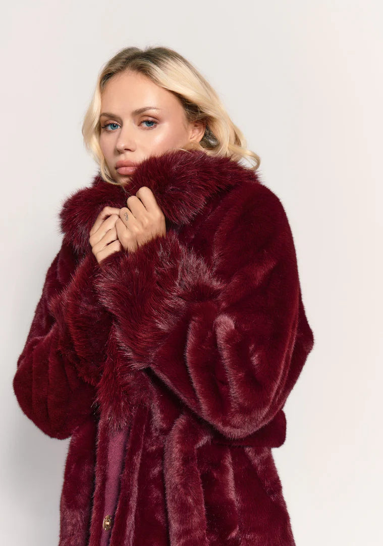 This faux fur coat features a stylish and voluminous design. It has a wide collar and furry cuffs, adding a touch of luxurious warmth. It's ideal for making a stylish and sophisticated statement at winter events.