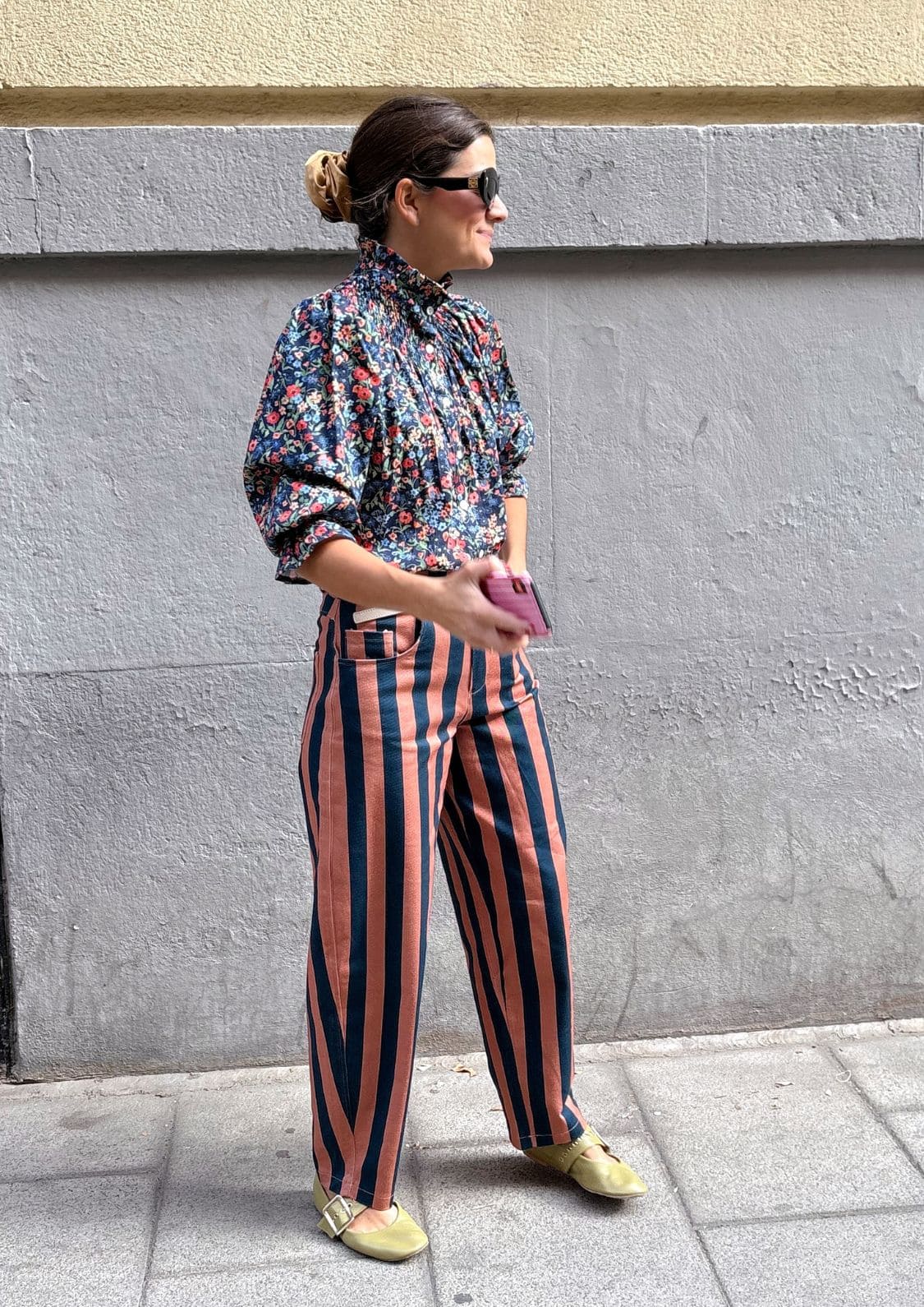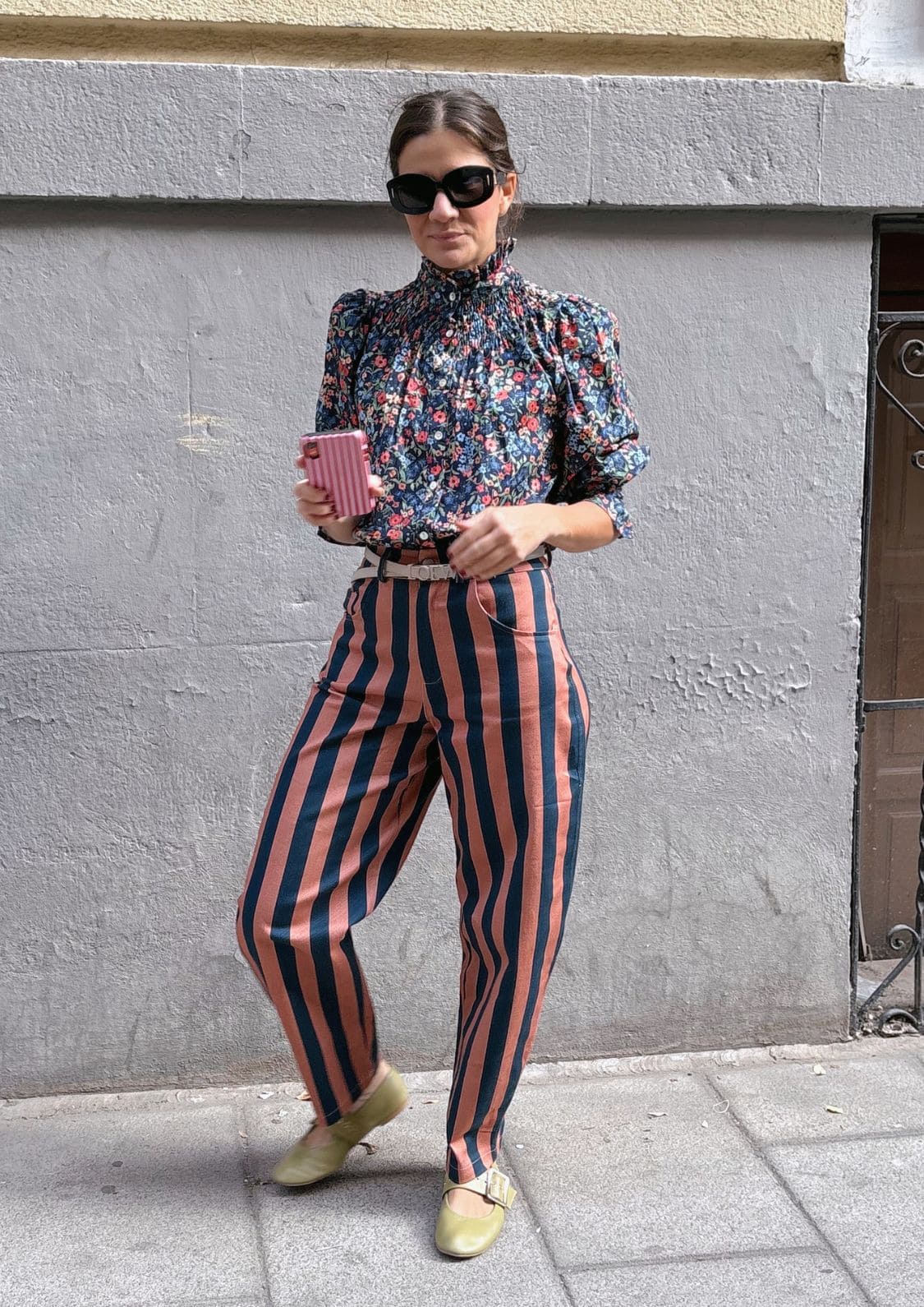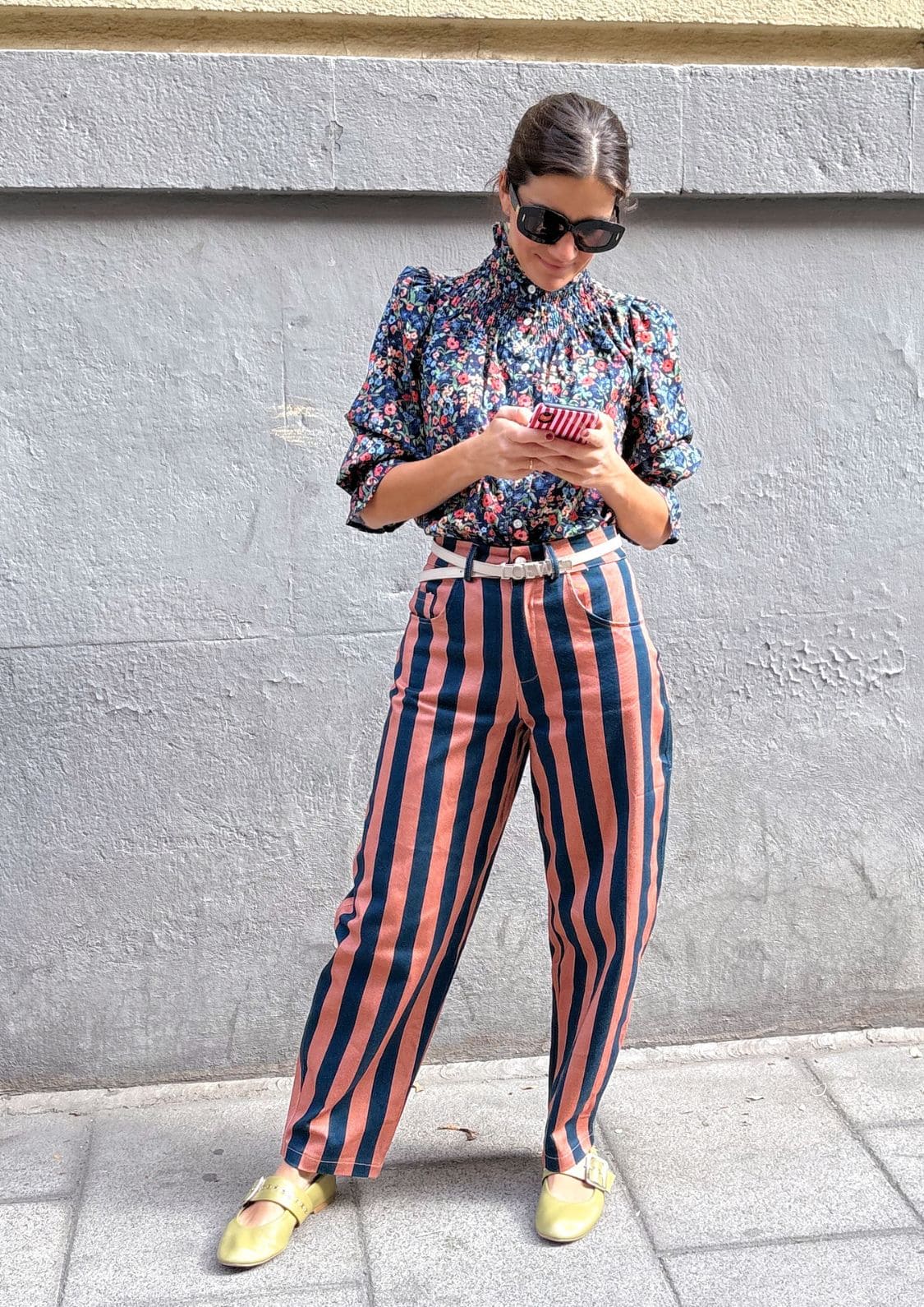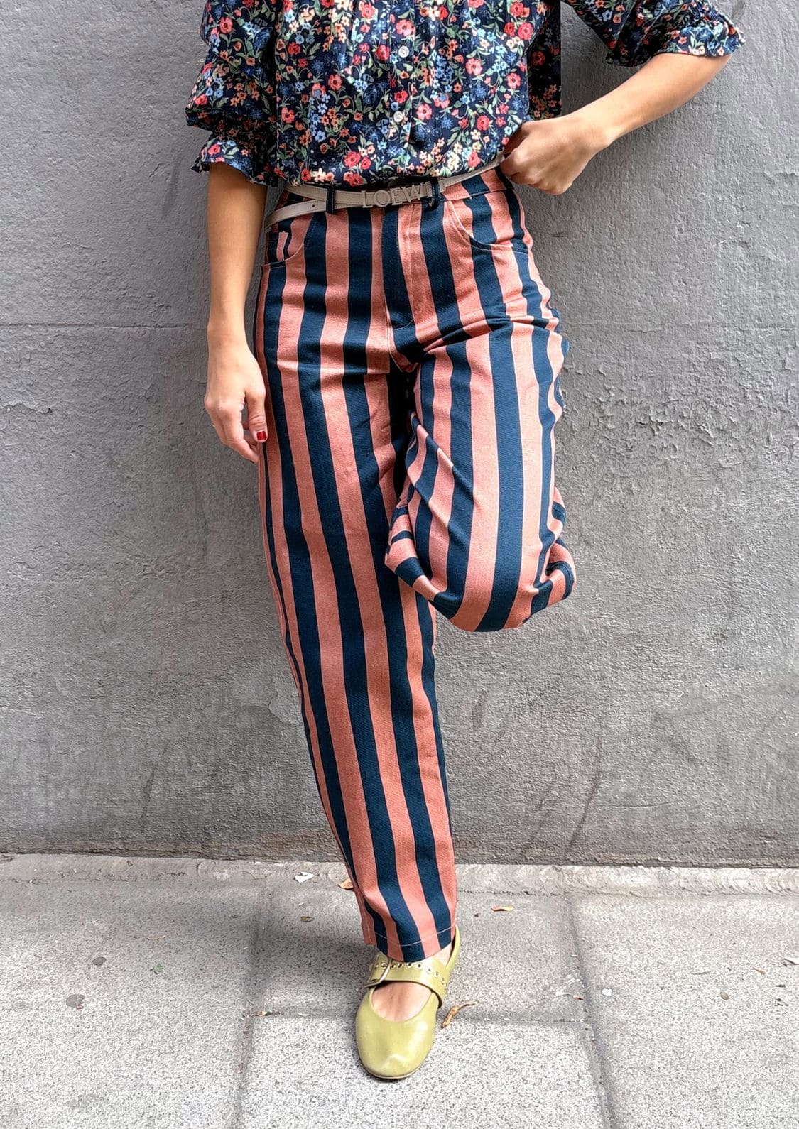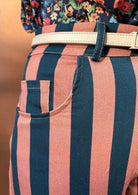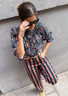 El nuevo Pantalón Copenhague es de esos que no pasan desapercibidos ni aunque lo intentes. Combina a la perfección con la blusa Milán por Eugeniota. Con su estampado de rayas verticales anchas en tonos salmón y azul marino, estiliza la figura y aporta un aire retro con muchísima personalidad. Tiene talle alto y corte balloon, lo que realza la silueta y lo hace tan favorecedor como cómodo.