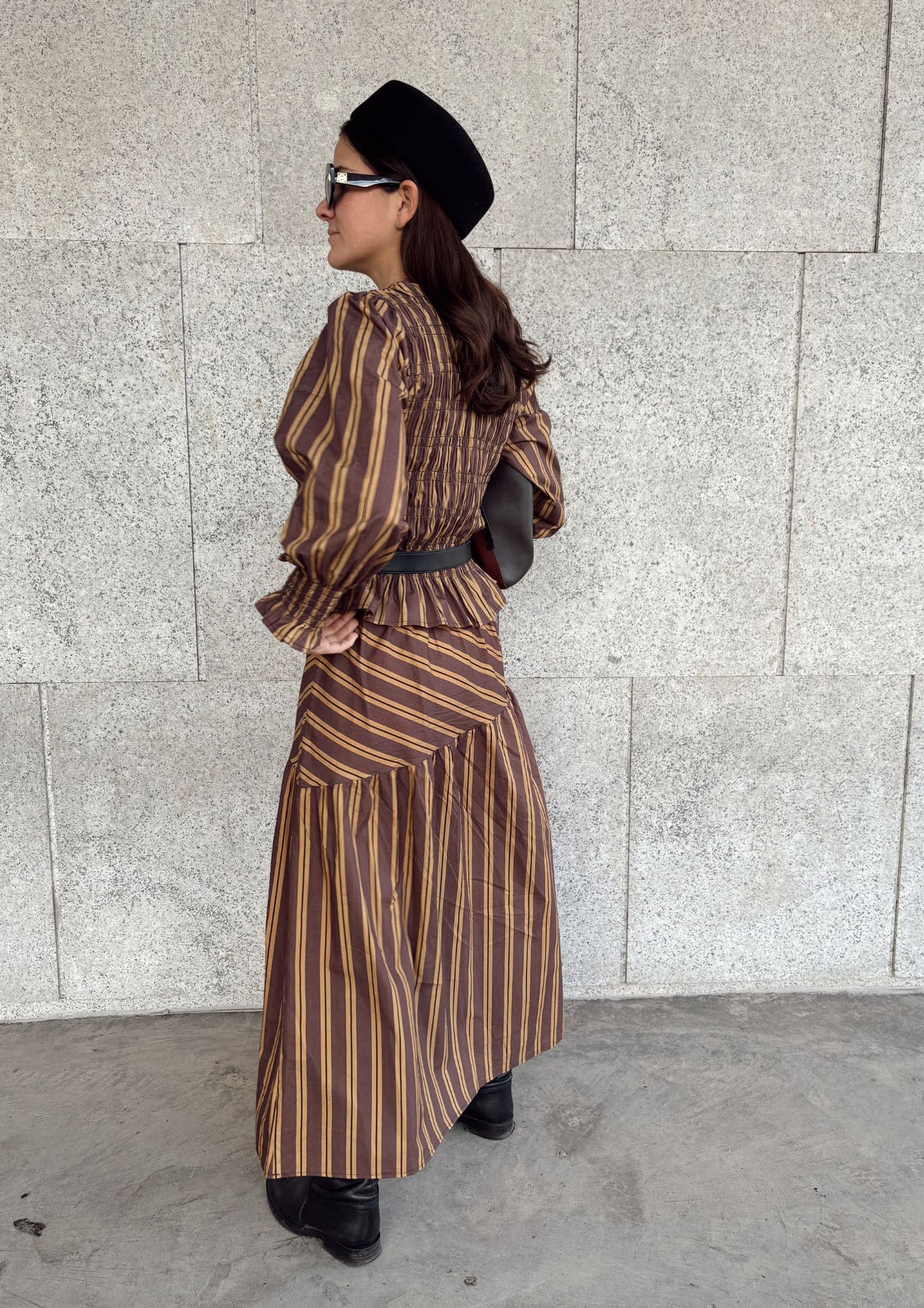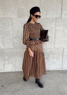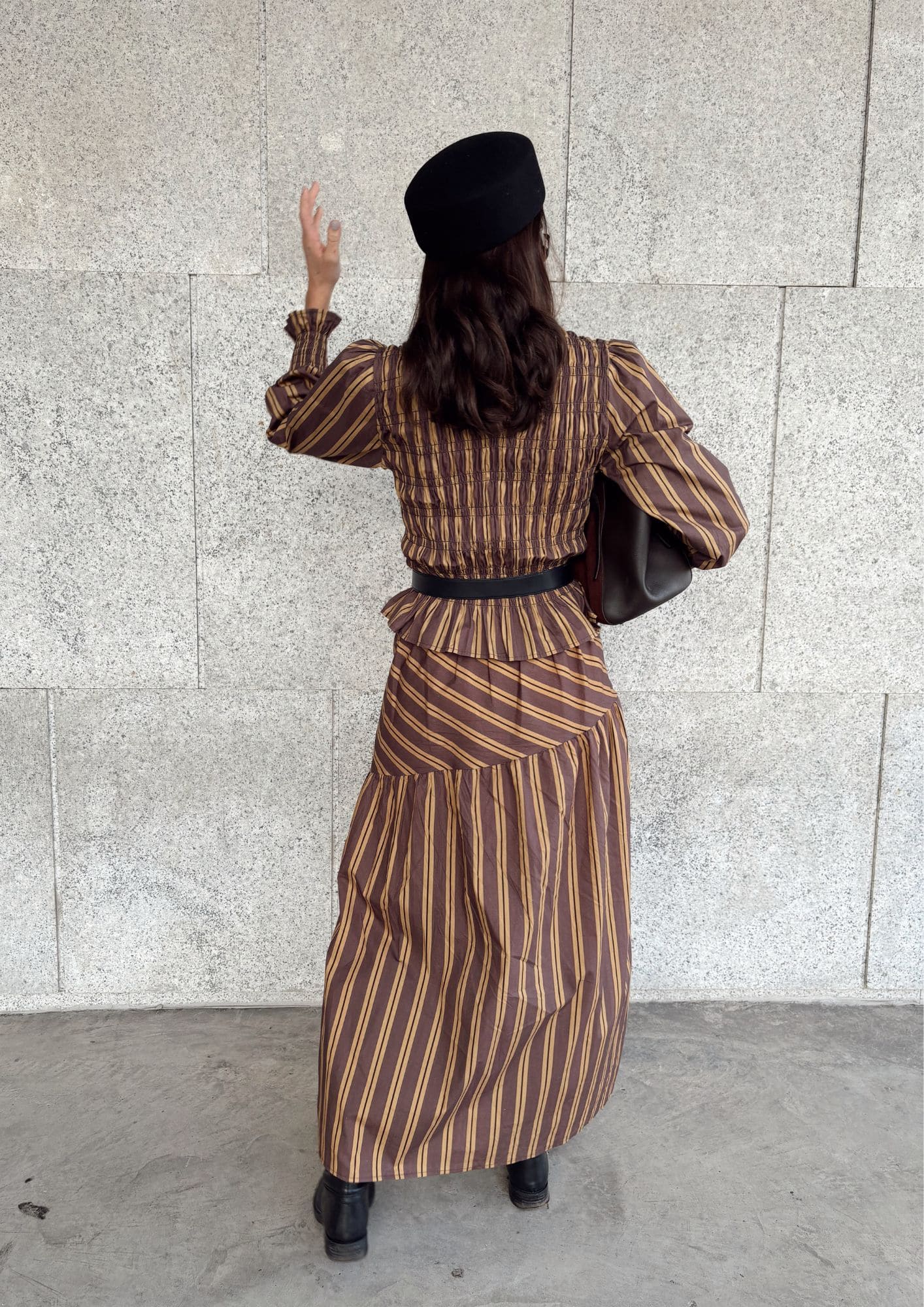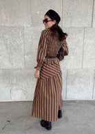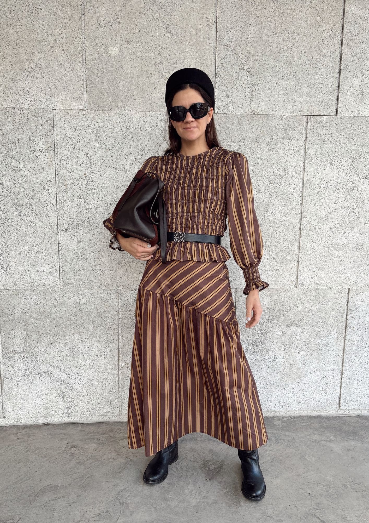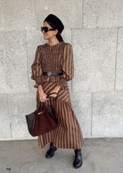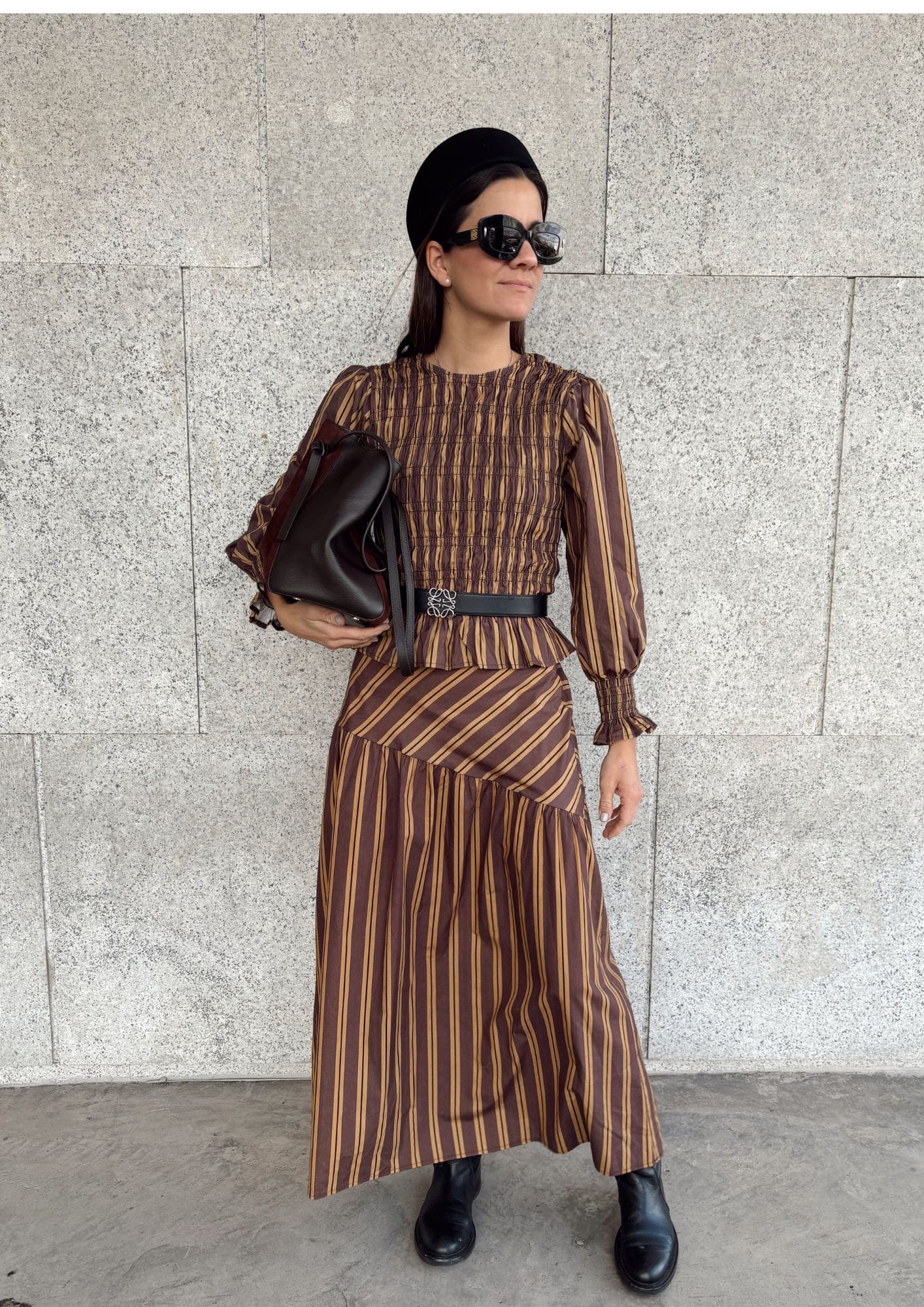 El estampado de rayas en tonos chocolate y beige estiliza y alarga la figura, convirtiéndolo en una prenda versátil tanto para looks de día como de noche. Ideal para llevar con su falda a conjunto o con unos vaqueros para un estilo más casual.