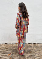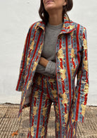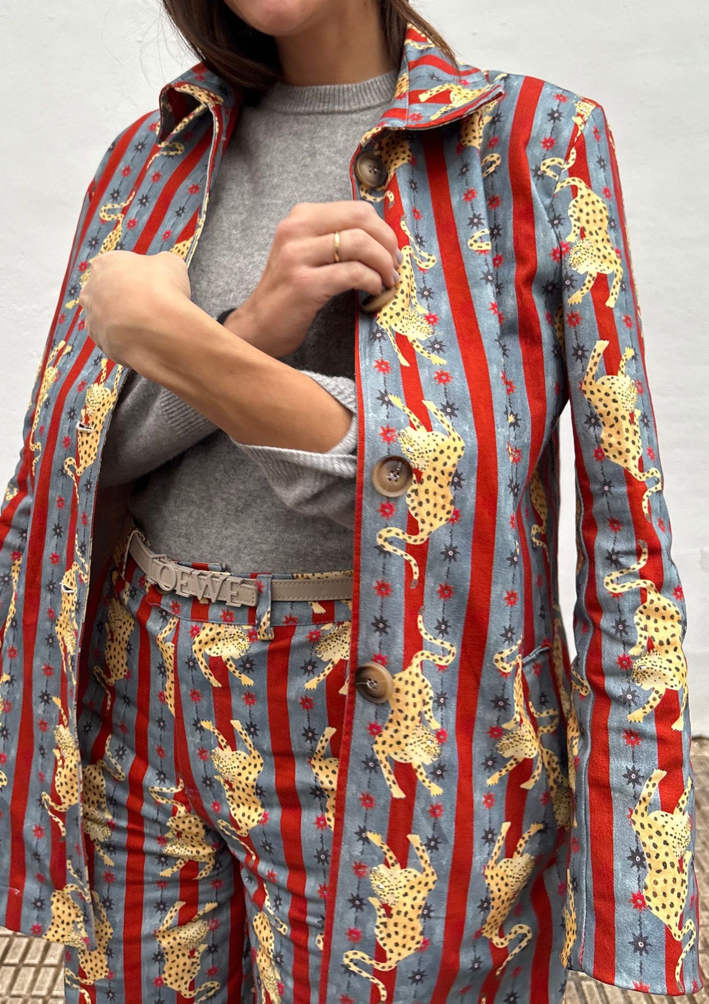 Chaqueta de corte recto confeccionada en un tejido estampado de inspiración vintage, con motivo de tigres sobre fondo de rayas verticales. Un diseño especial y muy reconocible, pensado para elevar cualquier look sin esfuerzo.