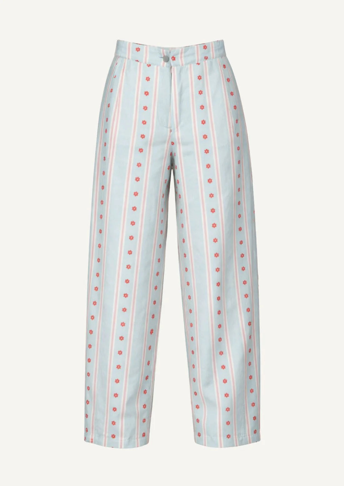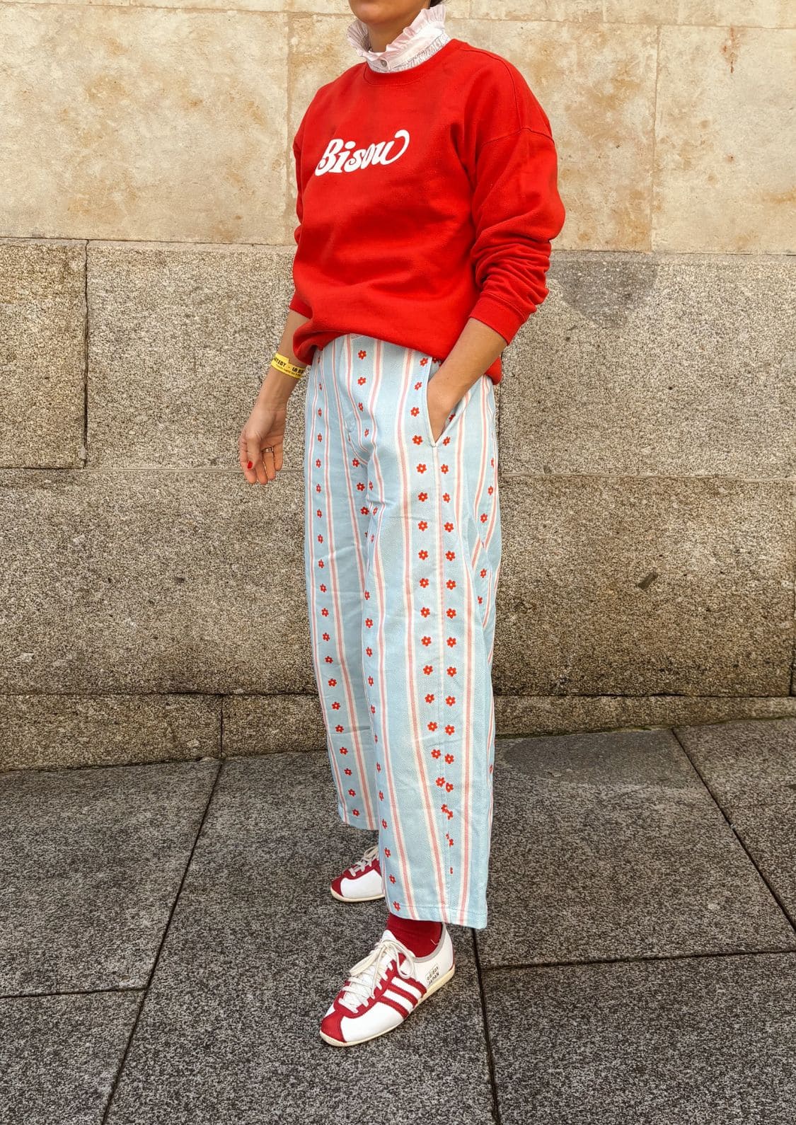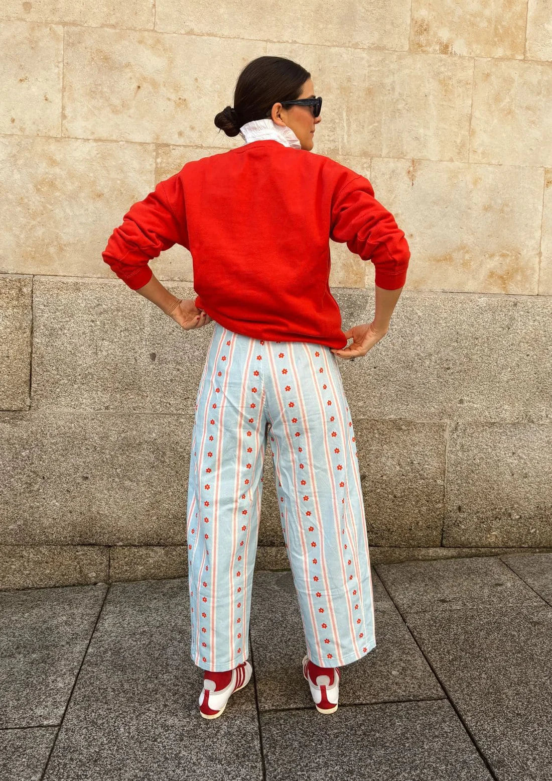 El nuevo Pantalón Bloom es de esos que no pasan desapercibidos ni aunque lo intentes. Con su estampado de rayas verticales en azul suave, combinado con delicadas flores en contraste, estiliza la silueta y aporta ese punto romántico y sofisticado que transforma cualquier look en algo especial. Tiene talle alto y corte balloon, lo que realza la silueta y lo hace tan favorecedor como cómodo.
