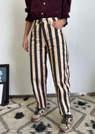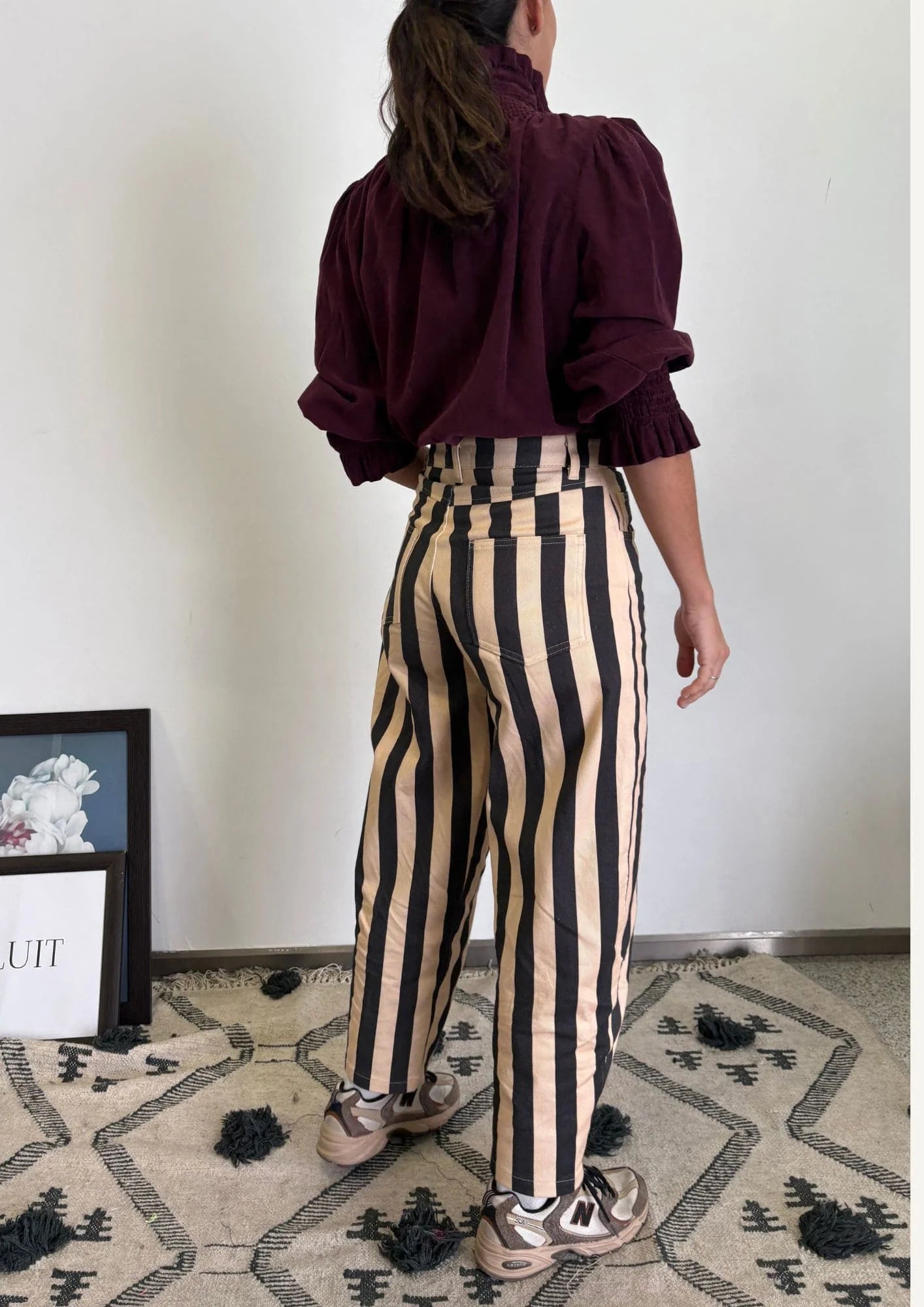 El nuevo Pantalón Copenhague es de esos que no pasan desapercibidos ni aunque lo intentes. Con su estampado de rayas verticales anchas en tonos negro y beige, estiliza la figura y aporta un aire retro con muchísima personalidad. Tiene talle alto y corte balloon, lo que realza la silueta y lo hace tan favorecedor como cómodo.