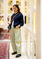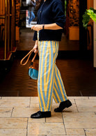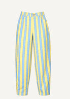 El nuevo Pantalón Nube es de esos que no pasan desapercibidos ni aunque lo intentes. Con su estampado de rayas verticales anchas con ondas en tonos amarillo y azul, estiliza la figura y aporta un aire retro con muchísima personalidad. Tiene talle alto y corte balloon, lo que realza la silueta y lo hace tan favorecedor como cómodo.