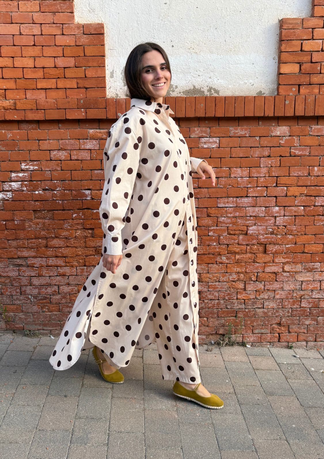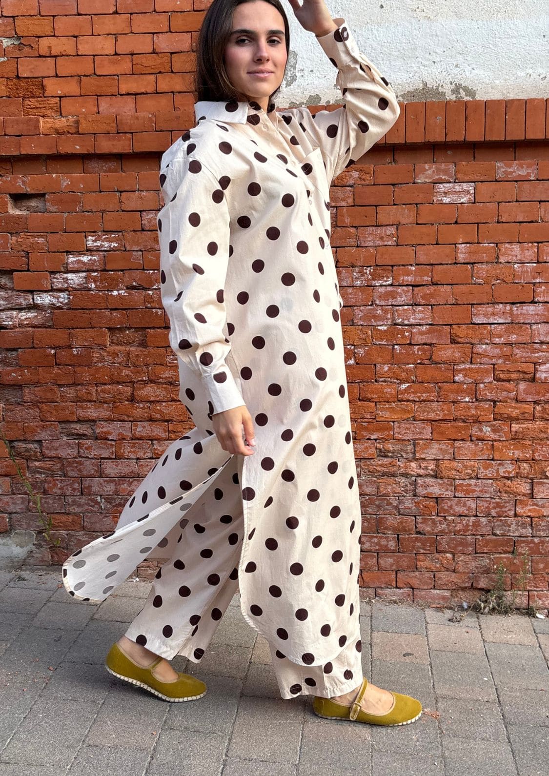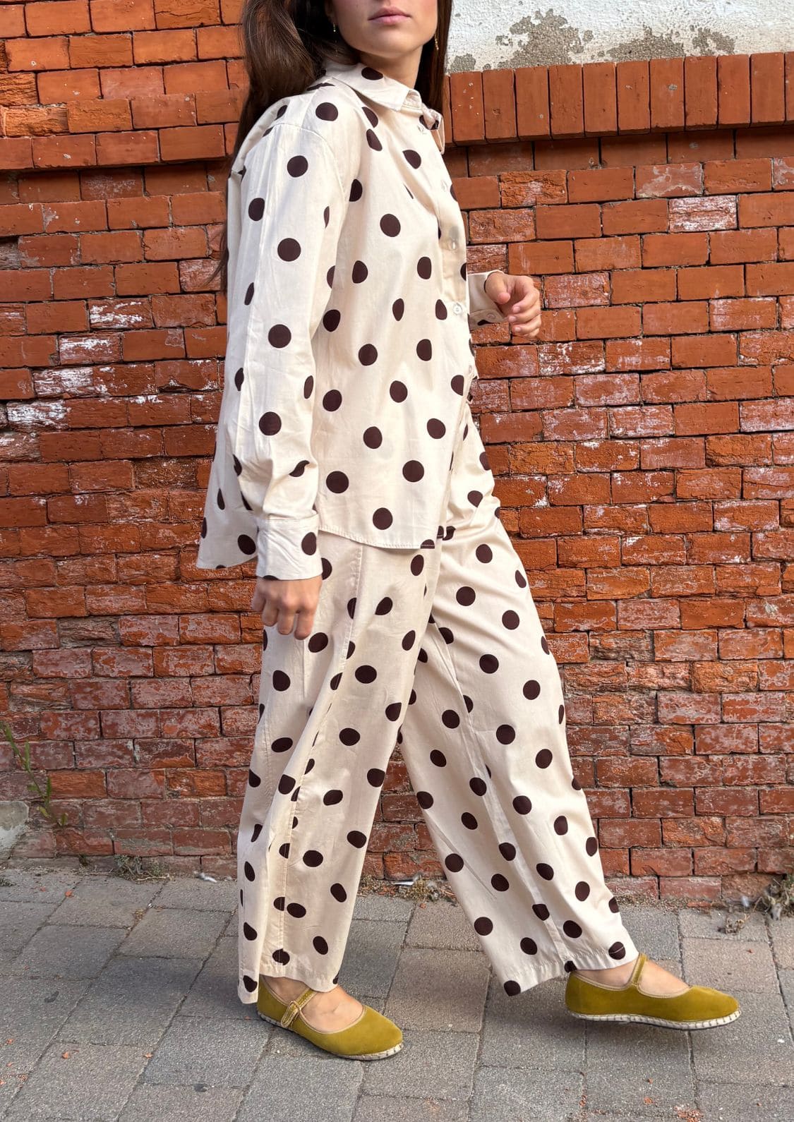 El estampado de lunares chocolate sobre fondo beige convierte a esta prenda en un básico especial, capaz de elevar cualquier look. Su cinturilla elástica en la espalda asegura comodidad y un ajuste perfecto, mientras que los bolsillos laterales añaden funcionalidad sin perder estilo.
