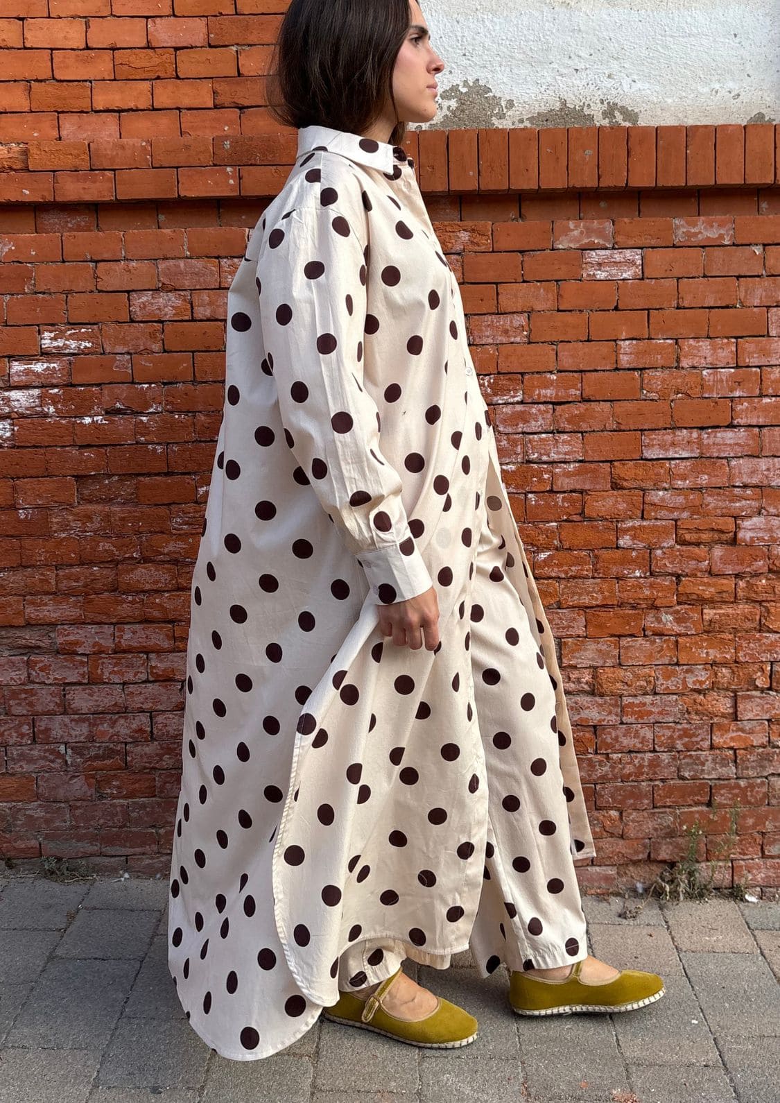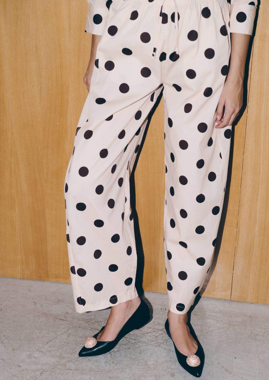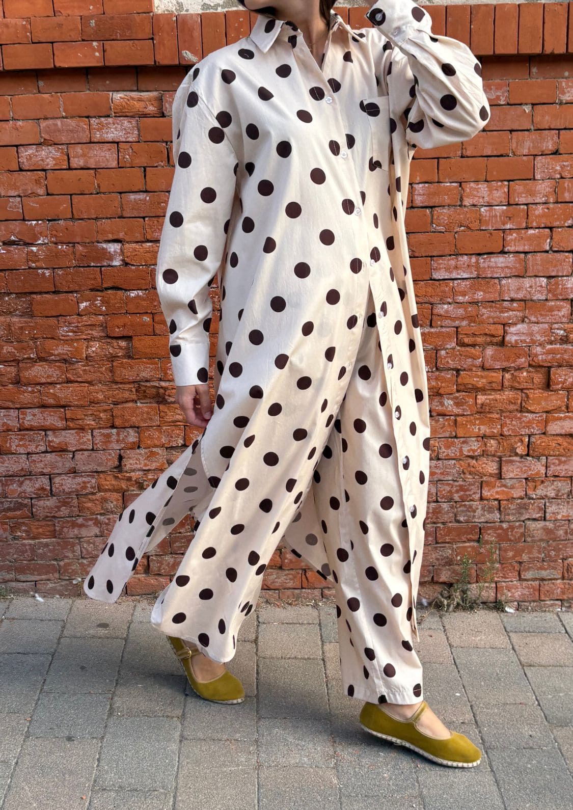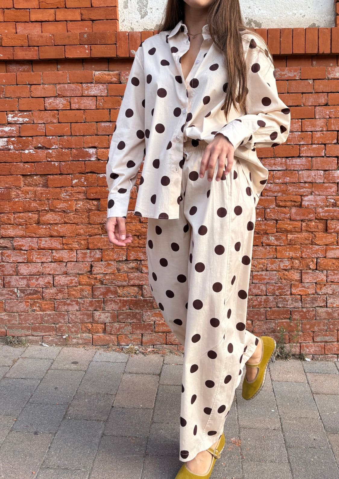 El estampado de lunares chocolate sobre fondo beige convierte a esta prenda en un básico especial, capaz de elevar cualquier look. Su cinturilla elástica en la espalda asegura comodidad y un ajuste perfecto, mientras que los bolsillos laterales añaden funcionalidad sin perder estilo.