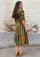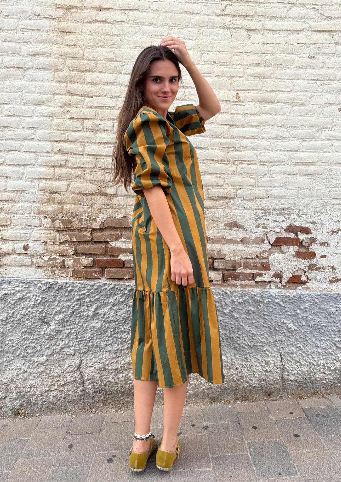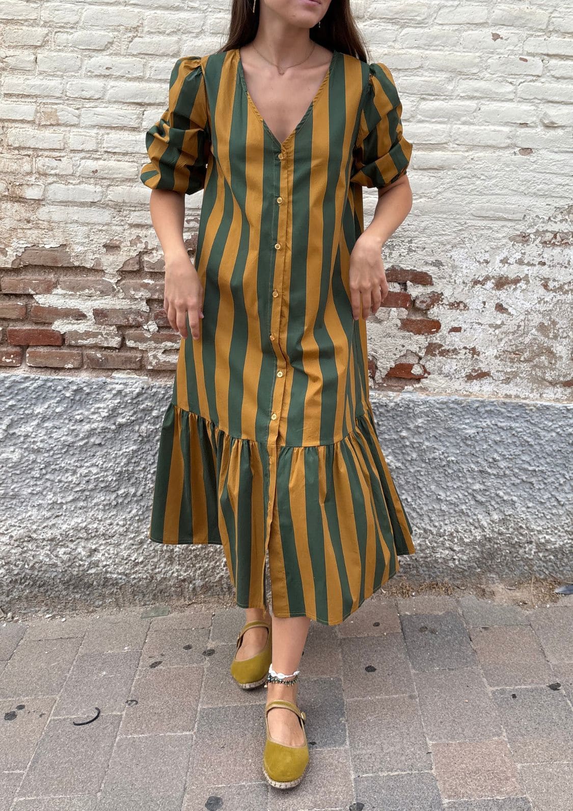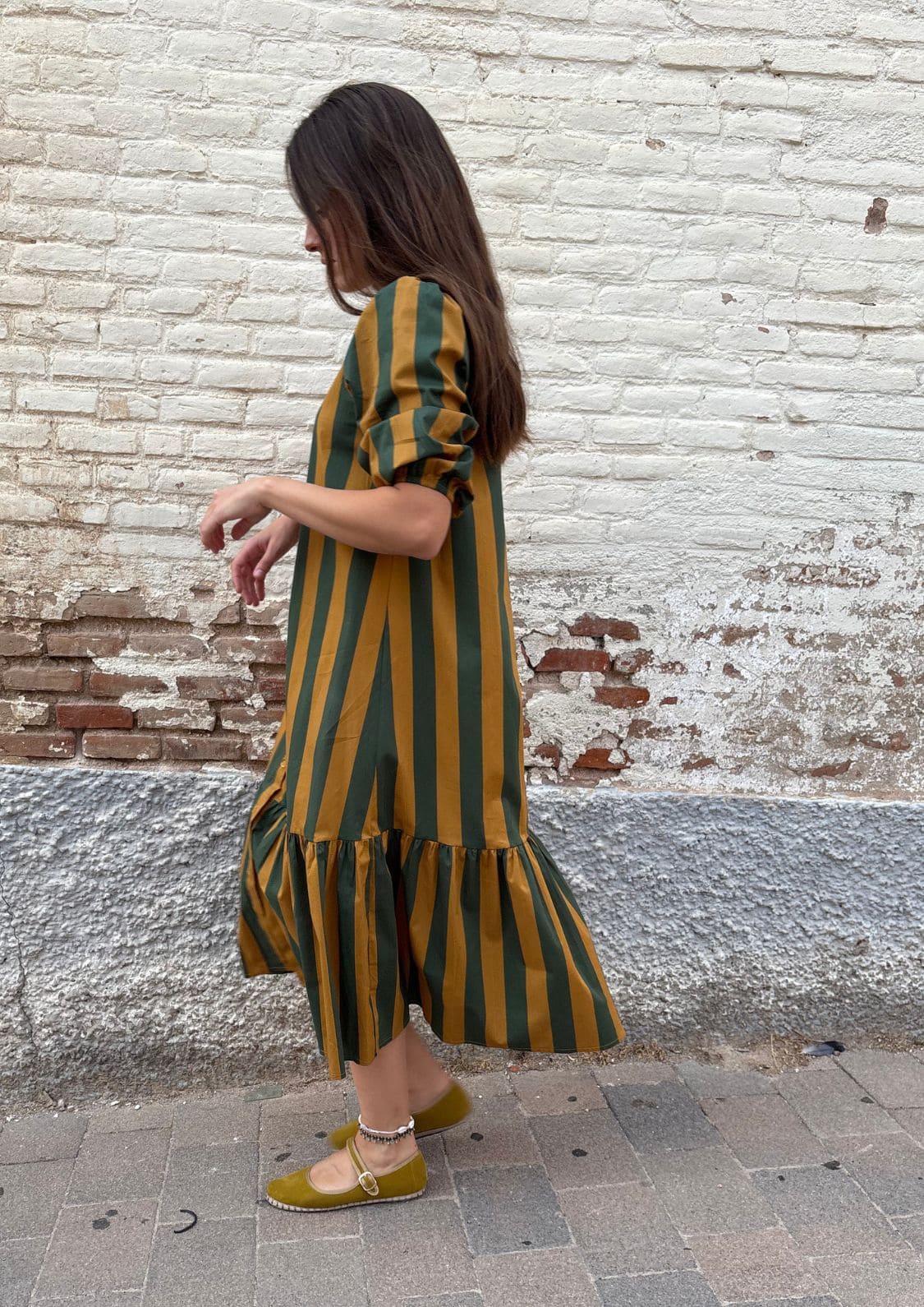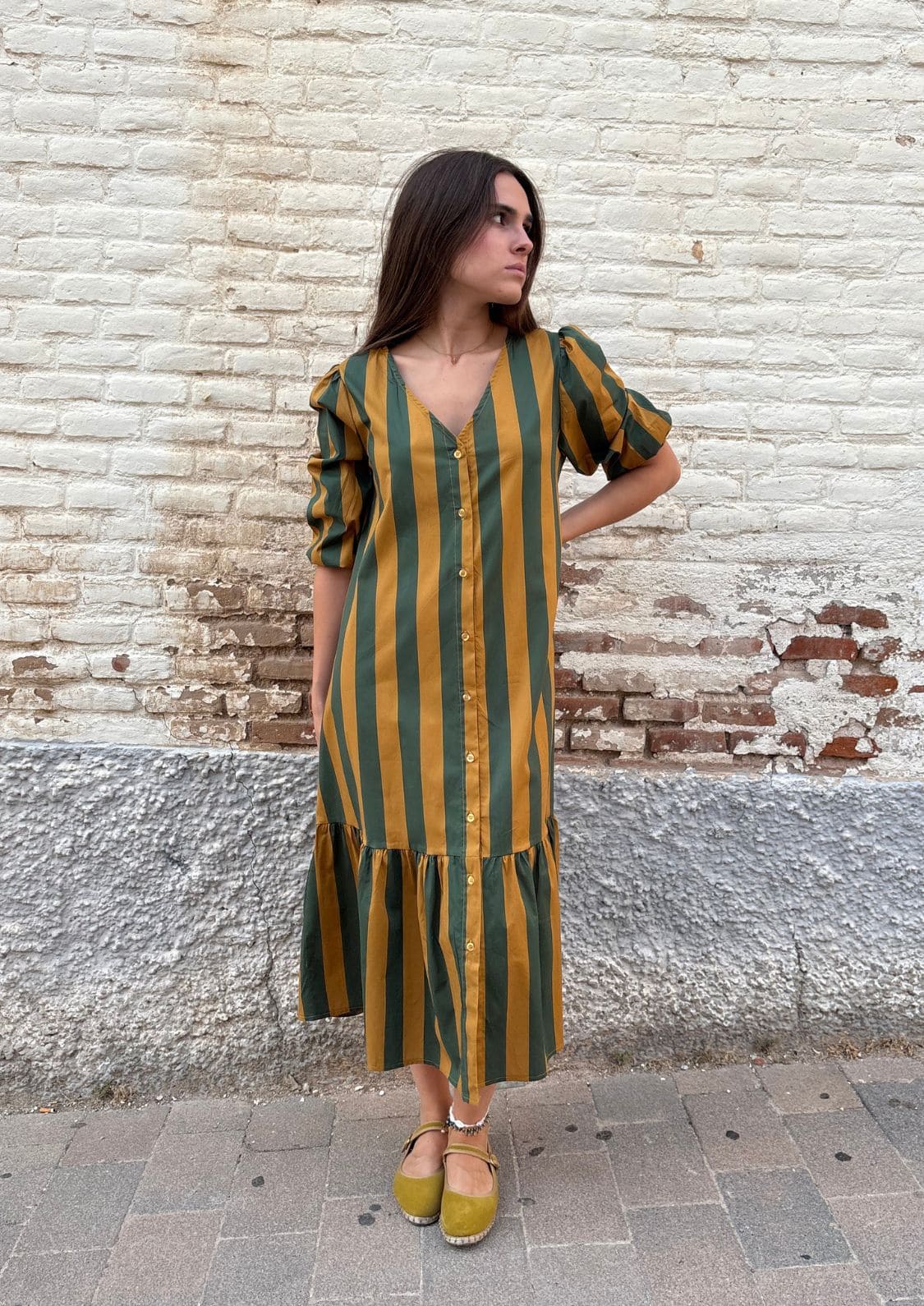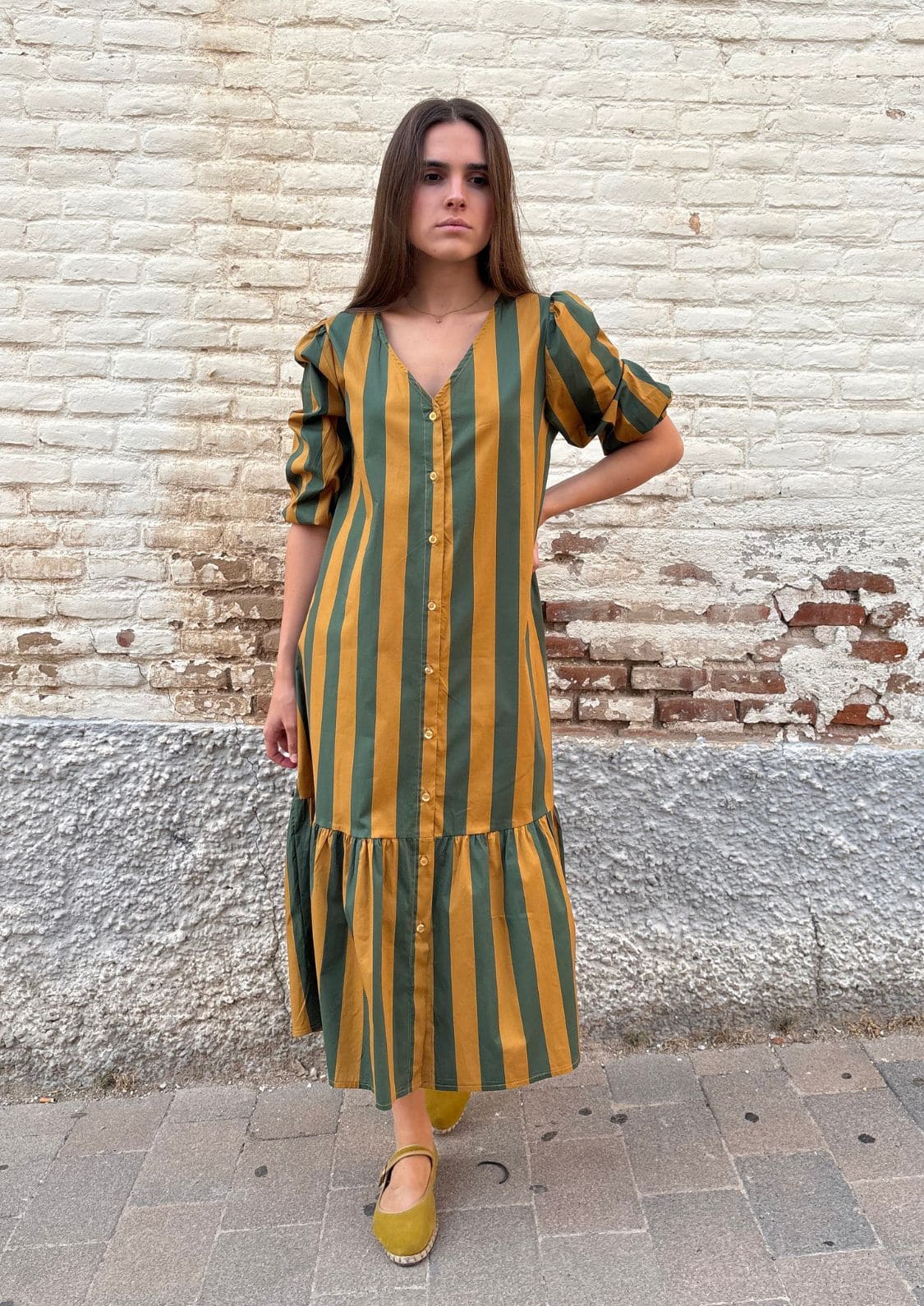 Confeccionado en tejido ligero y fresco, su estampado de rayas verticales en tonos verde y mostaza alarga visualmente la figura. El detalle del volante en el bajo añade movimiento y un toque desenfadado que lo convierte en una prenda versátil, perfecta tanto para el día a día como para ocasiones especiales.